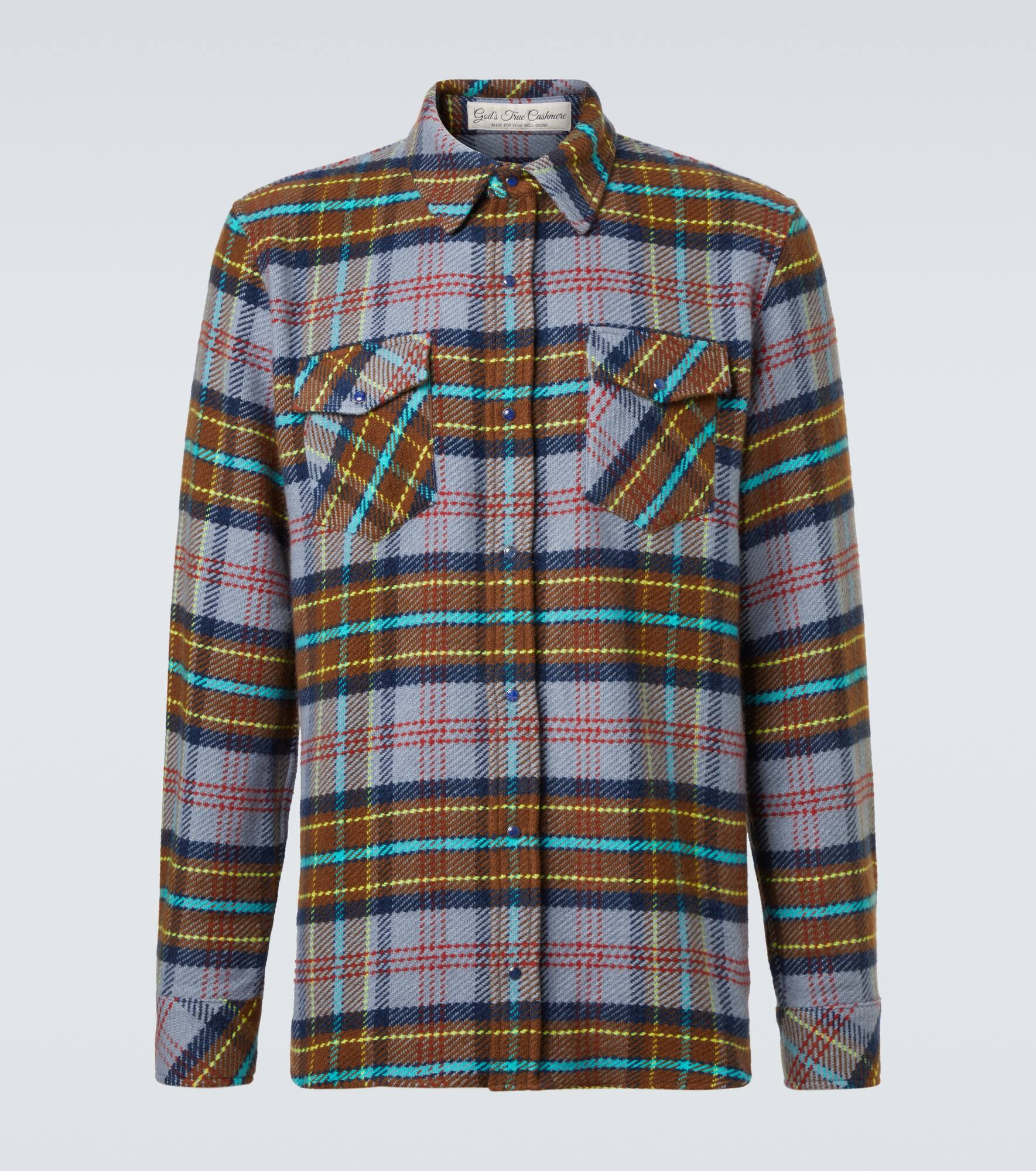Made from pure cashmere, this shirt features a plaid print and lapis lazuli embellishments. Each God’s True Cashmere shirt is adorned with hand-carved gemstones at the placket, pockets, and cuffs, thoughtfully selected for their positive qualities. Product Details - Material: 100% cashmere - Care instructions: hand wash - Made in Italy - Designer color name: Stone Jeans Tartan - Item color: multicolor - Collar: classic (Straight point) - Closure: snap-buttoned front - Pockets: flap chest pockets - Cuff: buttoned - Includes: dust bag - Item number: P01087744 Size & Fit - True to size - Without pleats in the back - Classic fit - Non-stretchy fabric - Falls below the hip - Height of model is 188cm-74" and wears a size L