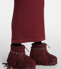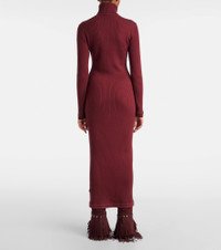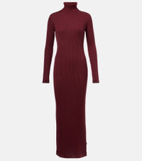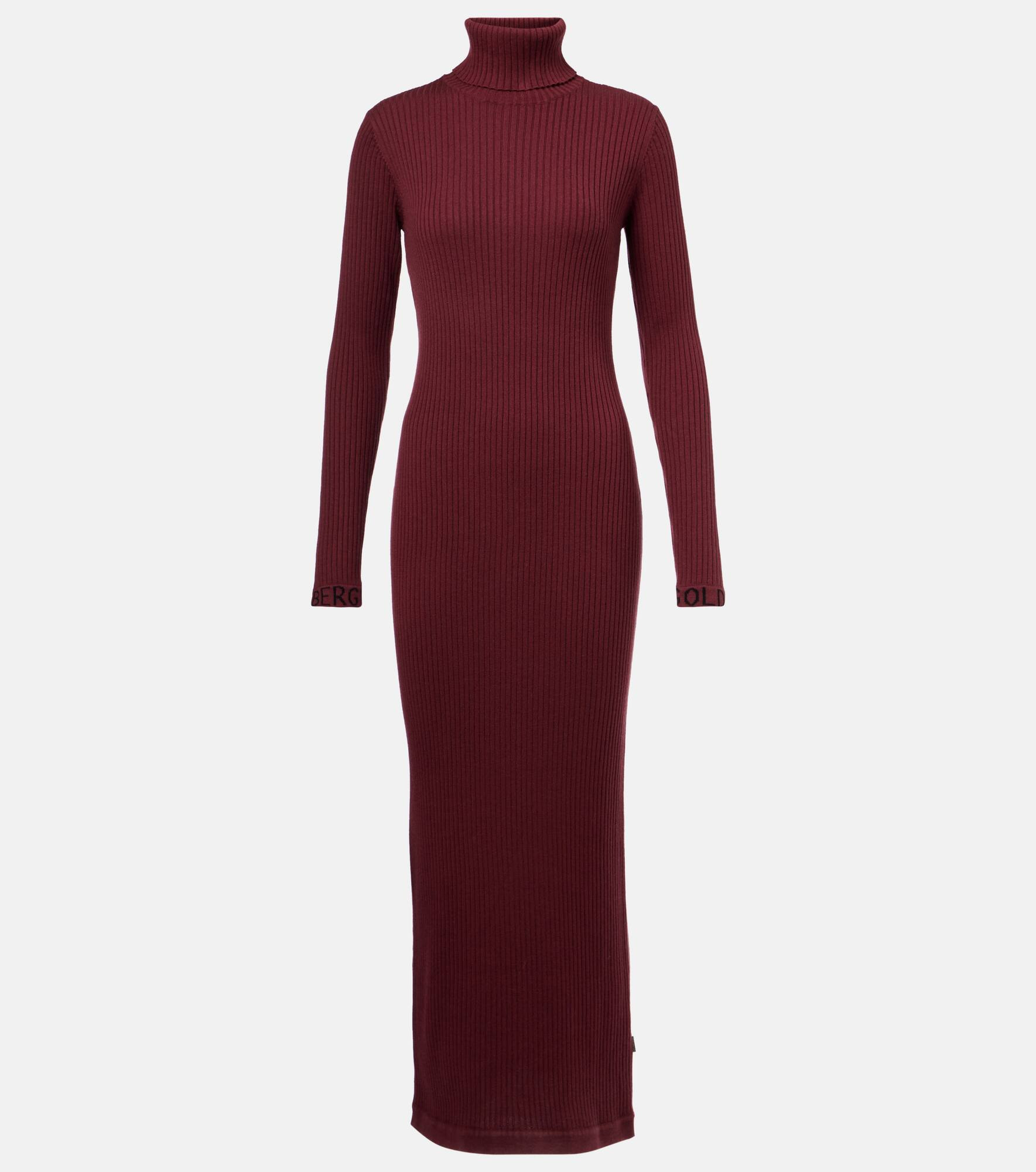 The Mireille midi dress from Goldbergh features a ribbed-knit design with the brand's jacquard lettering on the cuffs. The fitted silhouette is complete with a cozy turtleneck and tonal metal logo on the left shoulder. Product Details - Material: 45% acrylic, 30% wool (merino wool), 25% nylon - Care instructions: specialist clean - Made in China - Designer color name: Vino Rosso - Item color: burgundy - Sleeves: long-sleeved - Slim fit - Collar: turtleneck - Item number: P01064182 Size & Fit - True to size - Fitted - Stretchy fabric - The model seen in the picture is 178cm-5'10" and wearing a size XS