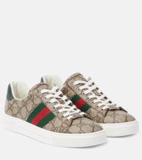 Sporting the signature interlocking G all over, the Ace leather-trimmed sneakers from Gucci are made from the label's original beige canvas, finished with the green and red Web, and set atop color-contrast rubber soles. Product Details - Upper: calf leather - Lining: leather - Sole: leather insole, rubber sole - Toe shape: round toe - Made in Italy - Includes: shoe box, dust bags, extra laces - Designer color name: Bei-Ebony/Vrv/Green - Closure: lace-up - Item number: P00880081 Size & Fit - Fits slightly large to size - we recommend trying a half size smaller - European sizes - 2,5cm-1" platform (size EU 38) - 3cm-1" wedge heel (size EU 38)