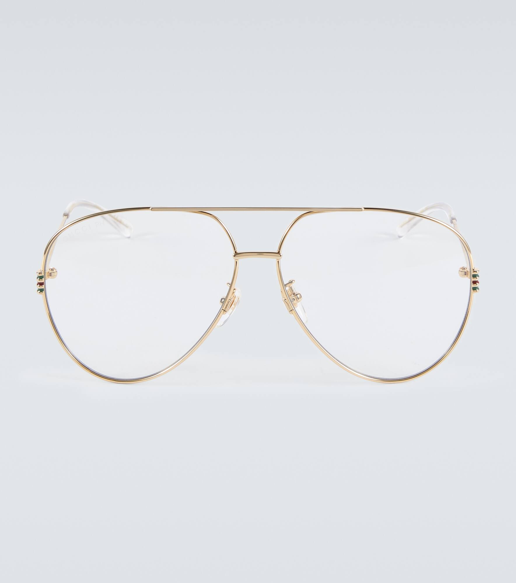 Spotlight Gucci's penchant for the past with the retro appearance of these glasses. Boasting a gold-tone wire frame, this aviator style has Web Stripe hinges and can be fitted with prescription lenses. Product Details - Frame color: gold - Frame material: metal - Lens color: transparent - comes with cleaning cloth - comes in a hard case - The color of the case may vary - Made in Japan - Item number: P00784906 Size & Fit - Lens width: 62mm-2.45" - Bridge size: 13mm-0.5" - Earpiece length: 140mm-5.5"