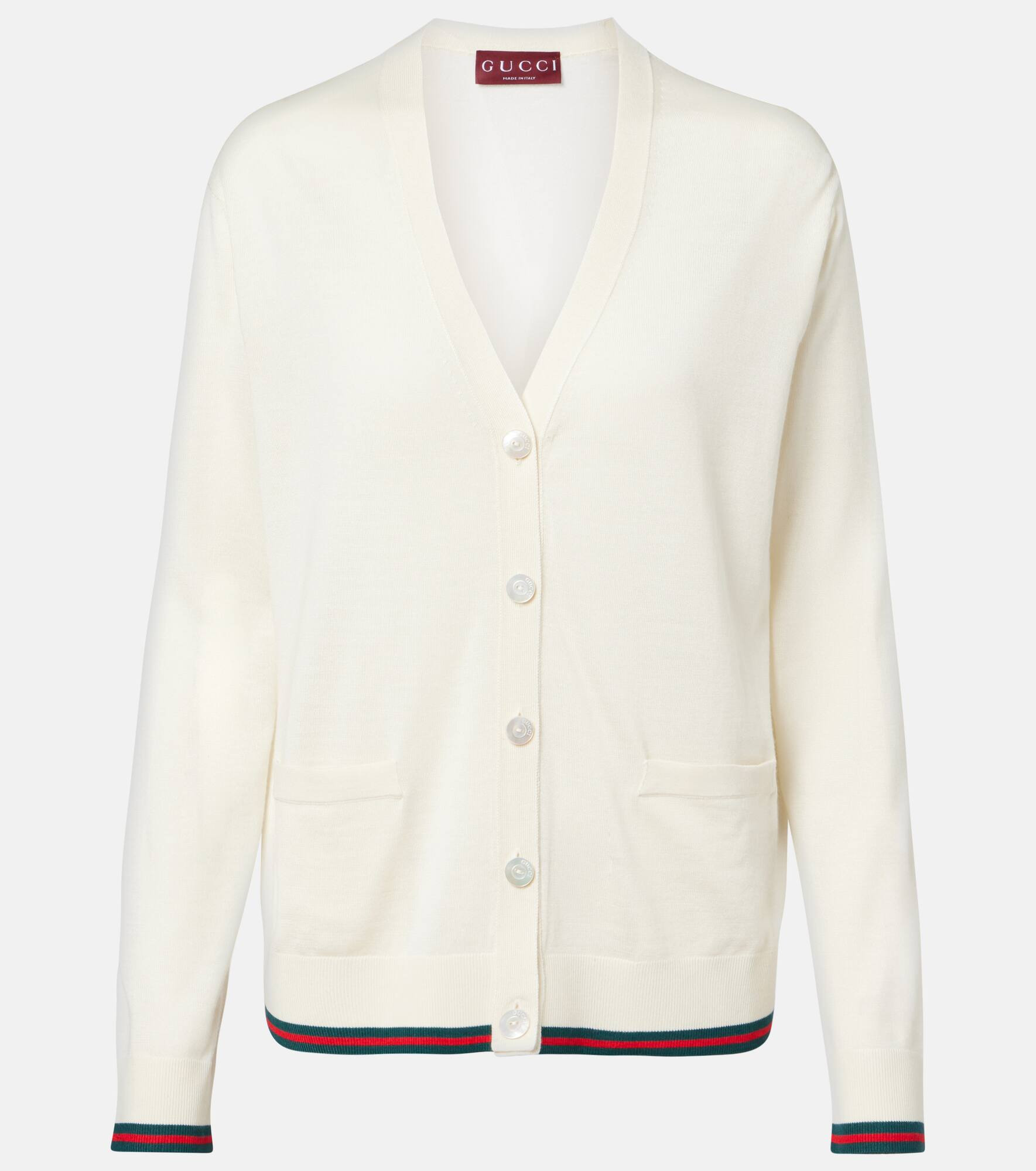 Gucci's cashmere and silk cardigan is made in Italy with a V-neck, buttoned front, and welt pockets. Ribbed cuffs and hem complete the design with a focus on refined texture and structure. Product Details - Material: 70% cashmere, 30% silk - Care instructions: dry clean - Made in Italy - Designer color name: White/Mc - Item color: white - Trim: 59% cashmere, 20% silk, 19% polyamide, 2% elastane - Contains non-textile parts of animal origin - Collar: V-neck - Closure: buttoned front - Cuff: ribbed - Hem: ribbed - Pockets: welt pockets - Item number: P01052756 Size & Fit - True to size - Dropped shoulders - Designed for a loose fit - Slightly stretchy fabric - Falls to the hip - The model seen in the picture is 178cm-5'10" and wearing a size XS