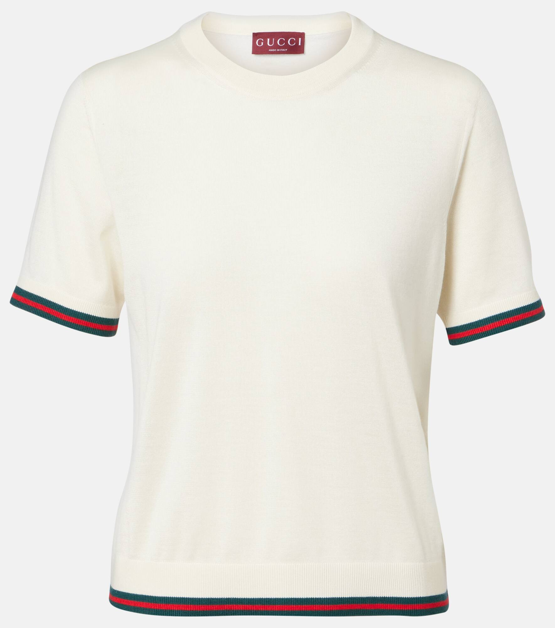 Gucci's cashmere and silk top is made in Italy with a crewneck collar, ribbed hem, and ribbed cuffs. The fine knit highlights the house’s commitment to quality and understated design. Product Details - Material: 70% cashmere, 30% silk - Care instructions: dry clean - Made in Italy - Designer color name: White/Mc - Item color: white - Trim: 59% cashmere, 20% silk, 19% polyamide, 2% elastane - Collar: crewneck - Cuff: ribbed - Hem: ribbed - Item number: P01052759 Size & Fit - True to size - Semi-sheer - Straight fit - Stretchy fabric - Falls to the hip - The model seen in the picture is 178cm-5'10" and wearing a size XS