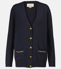 This dark blue cardigan is from Gucci's Ouverture collection, which mixes archival codes with modern silhouettes. It's made in Italy from cashmere and trimmed with golden pocket chains featuring the house's Interlocking G hardware. Product Details - Pockets: snap-buttoned pockets - Material: 100% cashmere - Made in Italy - Trim: 96% cashmere, 3% polyamide, 1% elastane - Closure: buttoned front - Care instructions: dry clean - Item number: P00584043 Size & Fit - True to size - Designed for a loose fit - Mid-weight material - Falls below the hip - The model seen in the picture is 178cm-5'10" and wearing a size XS