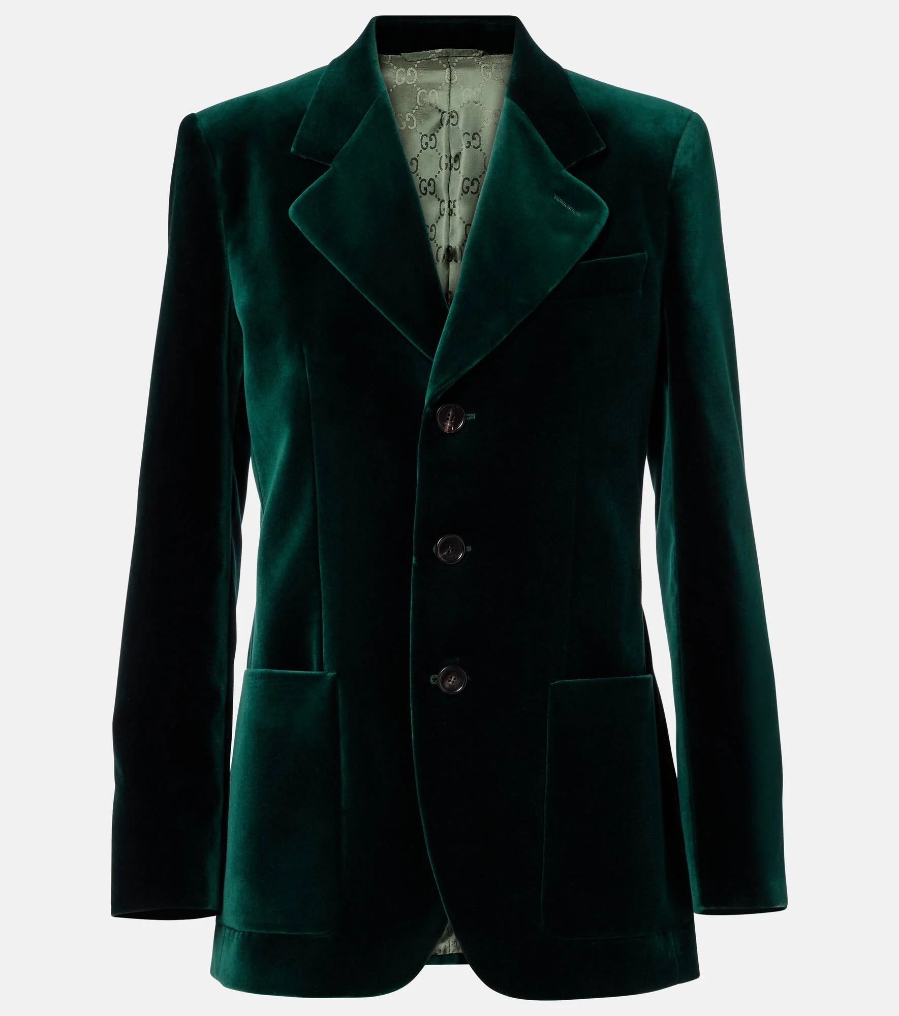 This Gucci blazer exudes timeless sophistication and gives structure to the silhouette with its padded shoulders and notched lapel. The garment is crafted from soft cotton velvet and lined with the signature GG pattern. Product Details - Material: 98% cotton, 2% elastane - Care instructions: dry clean - Made in Italy - Designer color name: Holly - Item color: green - Lining: 100% viscose - Lining II: 50% viscose, 50% wool - Contains non-textile parts of animal origin - Notched lapel - Shoulder pads - Closure: buttoned front - Pockets: ticket pocket, patch pockets, internal pockets - Cuff: four buttons - Fully lined - Item number: P01088130 Size & Fit - True to size - Shoulder pad inserts - Cinched waist - Non-stretchy fabric - Falls below the hip - The model seen in the picture is 178cm-5'10" and wearing a size IT 40