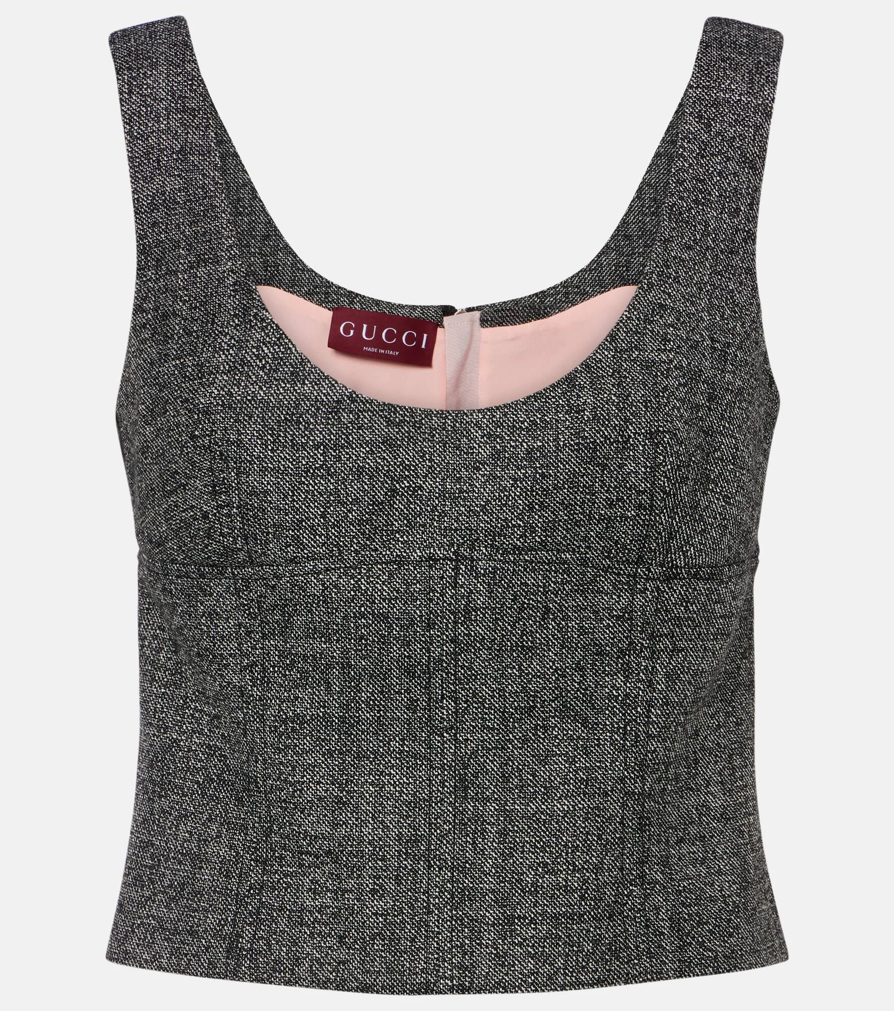 Gucci reinterprets the past in order to create something that is uniquely modern. This tank top is made in Italy from wool to a fitted silhouette with a fitted low-cut scoop neckline. Product Details - Material: 100% wool - Care instructions: dry clean - Made in Italy - Designer color name: Black/White - Item color: black, white - Lining: 75% acetate, 25% silk - Hardware color: silver - Closure: zipped back - Item number: P01119298 Size & Fit - Fits large to size - we recommend trying one size smaller - Cinched waist - Non-stretchy fabric - Slightly cropped - The model seen in the picture is 178cm-5'10" and wearing a size IT 38
