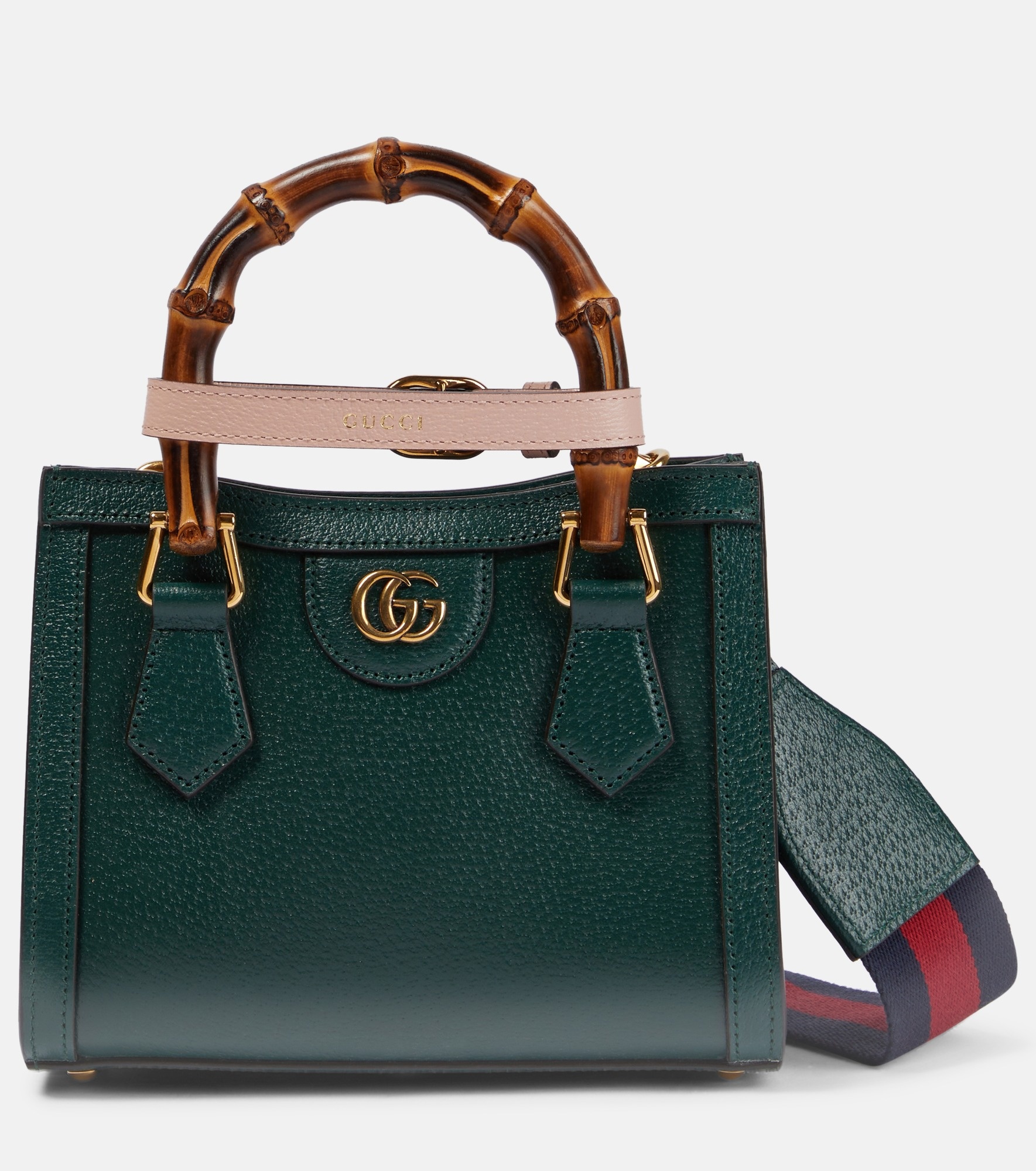 Made from leather and hanging from a grosgrain ribbon shoulder strap, Gucci's Diana Mini tote bag affirms the House's commitment to reinvention. Modernized with a contrast-color leather band, the downsized design’s bamboo top handles honor the original 1991 style. Product Details - Closure: snap-buttoned fastening - Internal details: internal slot pocket, leather lining - Material: leather - Made in Italy - detachable, adjustable shoulder strap, top handles - Item number: P00827719 Size & Fit - Height 16cm-6.5" - Width 20cm-8" - Depth 9,5cm-3.5" - Length of handles 28cm-11" - Min. length shoulder strap 92cm-36" - Max. length shoulder strap 146cm-57.5" - Min. strap length 93cm-36.5" - Max. strap length 108cm-42.5" - Suitable for large smartphones (e.g. iPhone 12 Pro Max / Samsung Galaxy A72, S21 Ultra/ Huawei P40 Pro, Mate 40 pro)