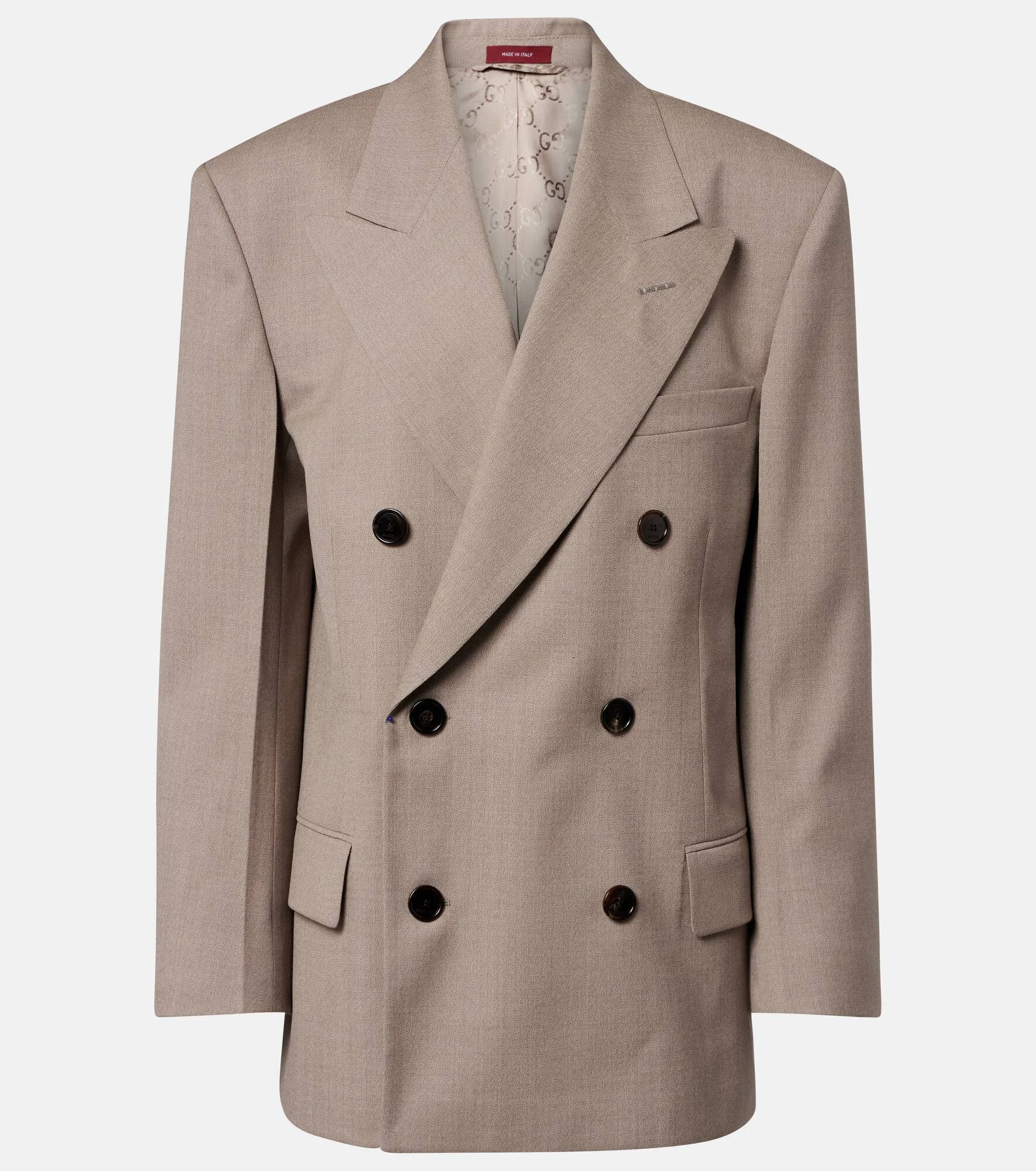 Gucci redefines luxury and pursues its commitment to excellence and creativity. Italian-crafted from wool mouline, this blazer is shaped into a relaxed, double-breasted silhouette with shoulder pads, peak lapels, and myriad pockets. Product Details - Material: 100% wool - Care instructions: dry clean - Made in Italy - Color: grey - Designer color name: Stone - Item color: gray - Lining: 100% viscose - Lining II: 63% wool, 37% viscose - Contains non-textile parts of animal origin - Shoulder pads - Cuff: four buttons - Pockets: flap pockets, internal pockets, breast pocket - Closure: double-breasted (six buttons) - Short vent - Item number: P01119109 Size & Fit - True to size - Shoulder pad inserts - Designed for a loose fit - Non-stretchy fabric - Falls below the hip - The model seen in the picture is 178cm-5'10" and wearing a size IT 40