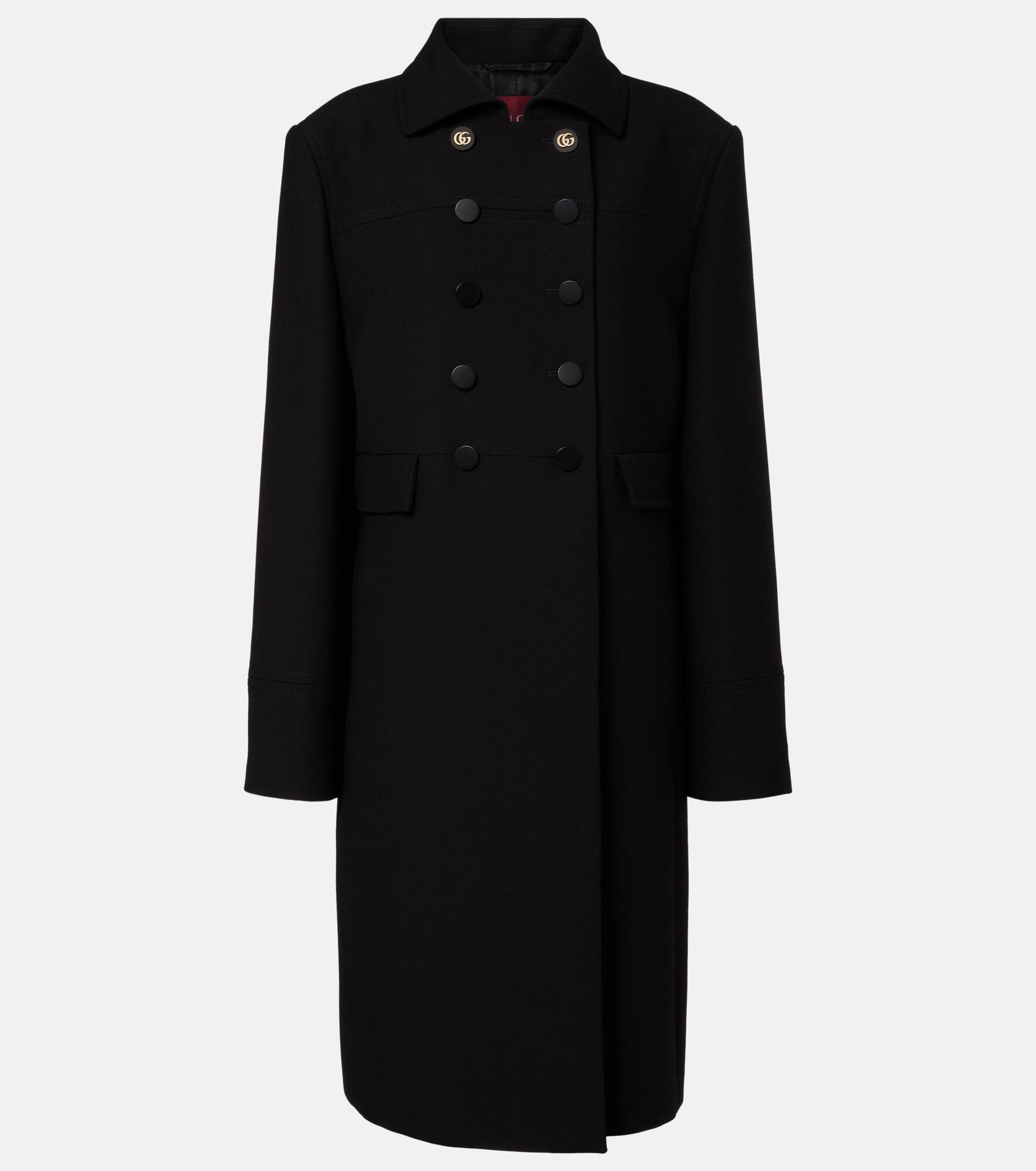 Gucci’s wool coat is made in Italy with a double-breasted front and long vent at the back. The design features flap and side slit pockets, buttoned cuffs, and signature Double G buttons at the collar for a discreet house finish. Product Details - Material: 100% wool - Care instructions: dry clean - Made in Italy - Designer color name: Black - Item color: black - Lining: 100% viscose - Contains non-textile parts of animal origin - Closure: double-breasted - Pockets: flap pockets, side slit pockets - Cuff: buttoned - Long vent - Item number: P01052640 Size & Fit - True to size - Shoulder pad inserts - Straight fit - Non-stretchy fabric - The model seen in the picture is 178cm-5'10" and wearing a size IT 40