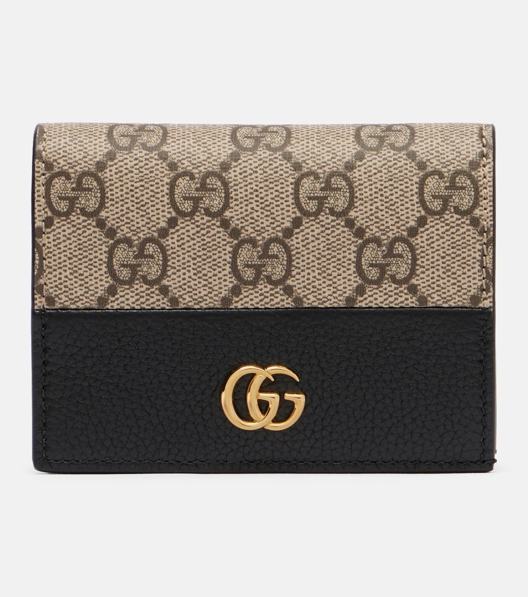 Approach mid-day coffee dates in style while holding Gucci's Mini wallet in hand. Crafted in Italy from leather, this accessory features a gold-toned DG logo, a snap-button closure, and a zipped coin pocket. Product Details - Material: leather - Lining: leather, fabric - Made in Italy - Designer color name: Black/Beige Ebony - Item color: black, gray - Hardware color: gold - Closure: snap-buttoned fastening - Internal details: zipped coin pocket - Includes: box, dust bag - Item number: P01089952 Size & Fit - Height 8cm-3" - Width 10.5cm-4" - Depth 2cm-1"