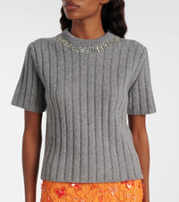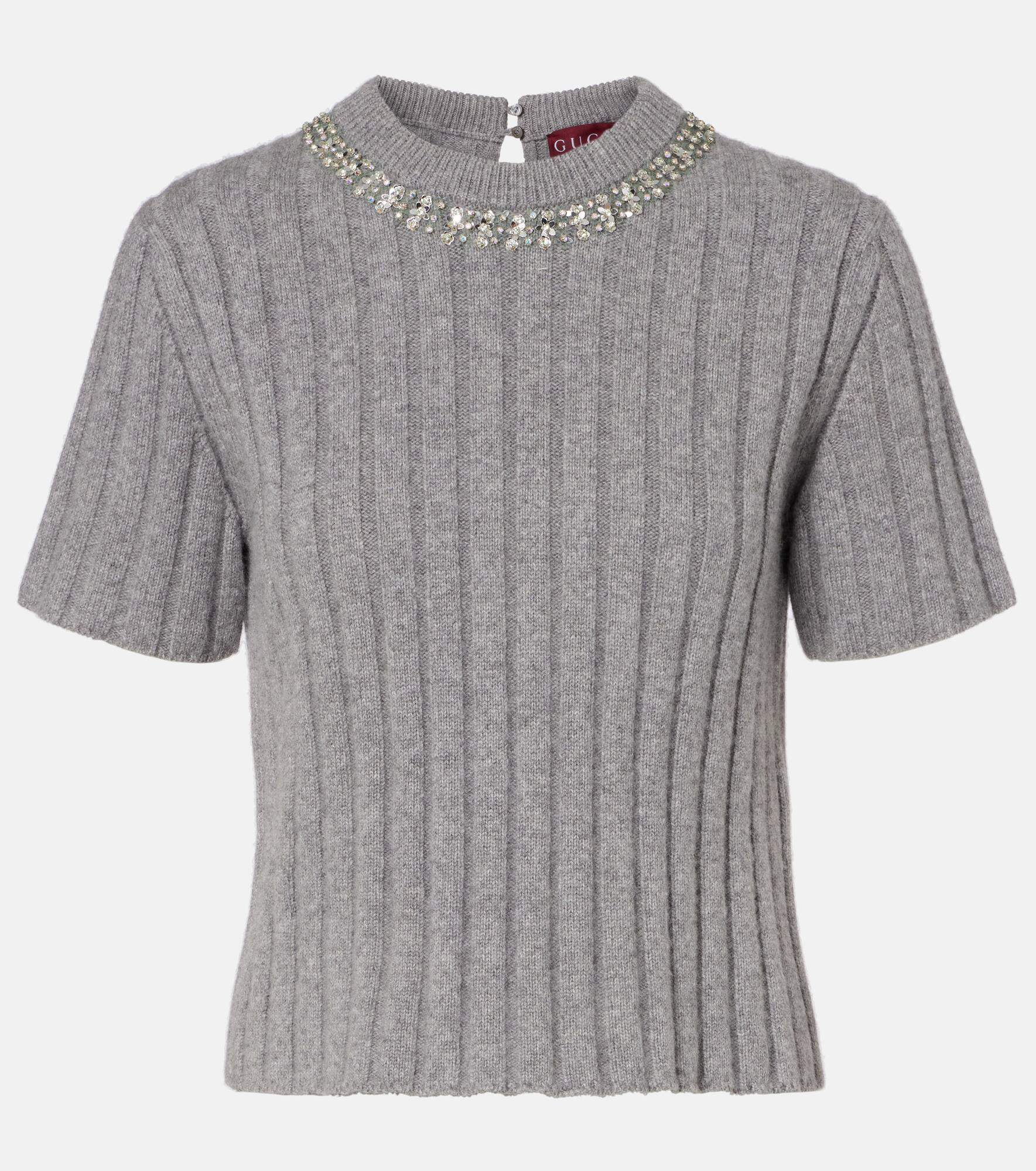 This sweater from Gucci is crafted in Italy from cozy wool and cashmere and features a short sleeved silhouette. The design is complete with crystal-embellishments at the neckline for a touch of glamour. Product Details - Material: 70% wool, 30% cashmere - Care instructions: dry clean - Made in Italy - Designer color name: Urban Grey/Mix - Item color: gray - Embroidery: 100% polyester - Details: 100% brass - Contains non-textile parts of animal origin - Closure: buttoned back - Collar: crewneck - Item number: P01088137 Size & Fit - True to size - Straight fit - Stretchy fabric - Falls to the hip - Height of model is 174cm-68.5" and wears a size XS