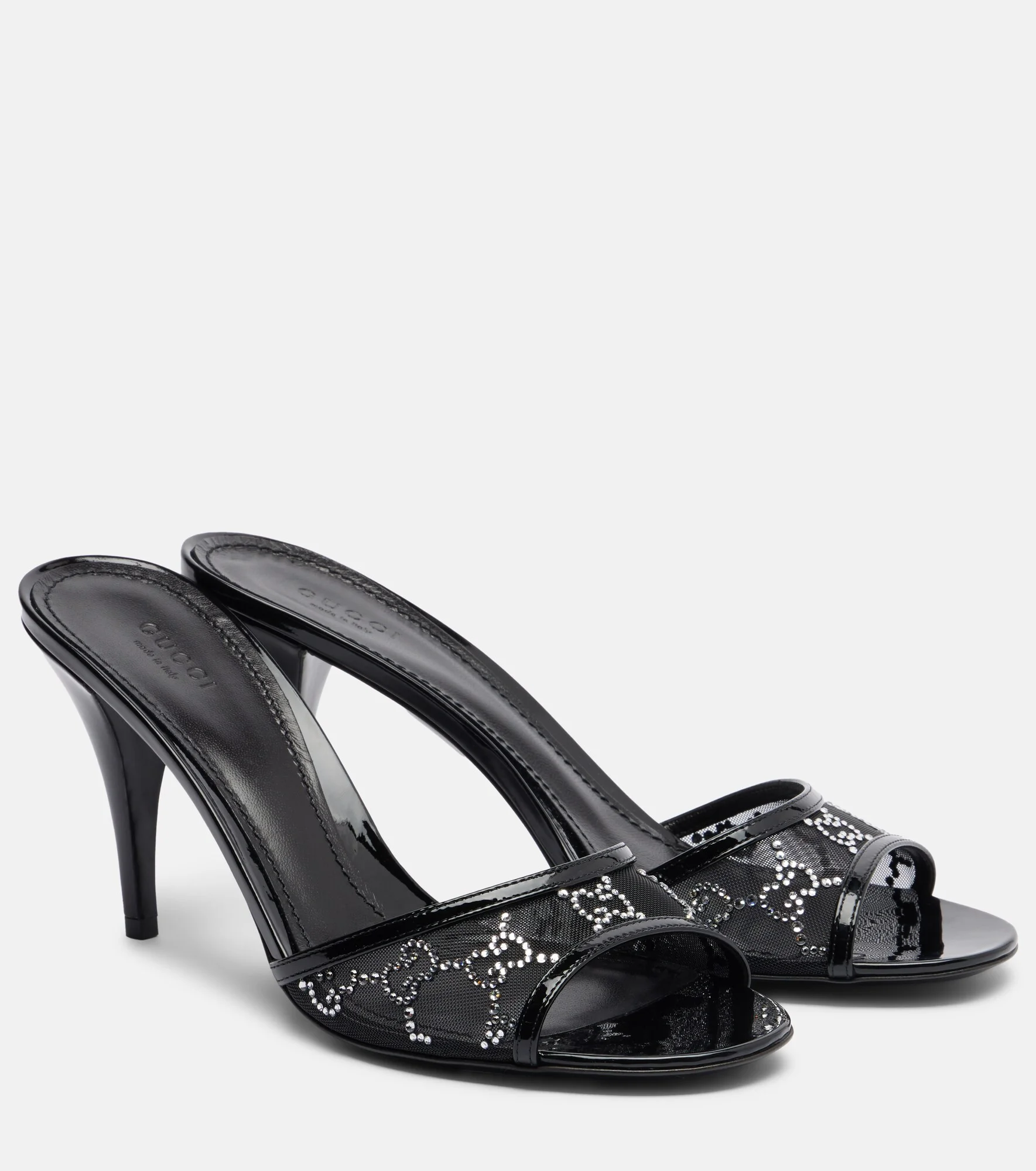 Gucci's collections are both a reflection of the past and a glimpse into the future. Designed with leather trims, the Erin mules are adorned with GG crystal embellishments on the mesh upper straps. Product Details - Upper: fabric - Lining: leather - Sole: leather insole and sole - Color: black - Toe shape: almond open toe - Made in Italy - Includes: dust bag, shoe box - Designer color name: Black/Black/Milady - Trim: leather - Details: crystals - Item number: P01131158 Size & Fit - Fits slightly large to size - we recommend trying a half size smaller - European sizes - 8,5cm-3.5" heel