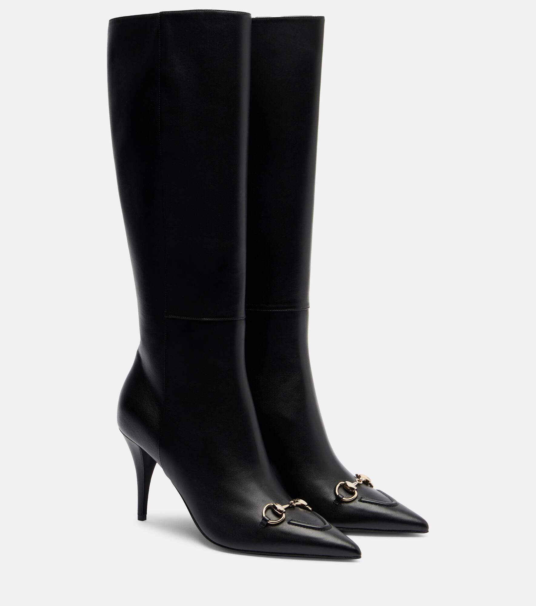 Elevate your looks with the Erin knee-high boots from Gucci. Crafted in Italy from supple leather, the pair feature sleek pointed-toe silhouettes with the house's signature gold-tone Horsebit hardware. Product Details - Upper: lamb leather - Lining: lamb leather - Sole: leather insole and sole - Toe shape: pointed toe - Made in Italy - Includes: shoe box, dust bag - Designer color name: Nero - Item color: black - Hardware color: gold - Closure: zipped side - Item number: P01063099 Size & Fit - True to size - European sizes - 8cm-3" heel (size EU 38) - 37cm-14.5" shaft height (size EU 38) - 36cm-14" shaft width (size EU 38) - shaft width measured on largest part of boot