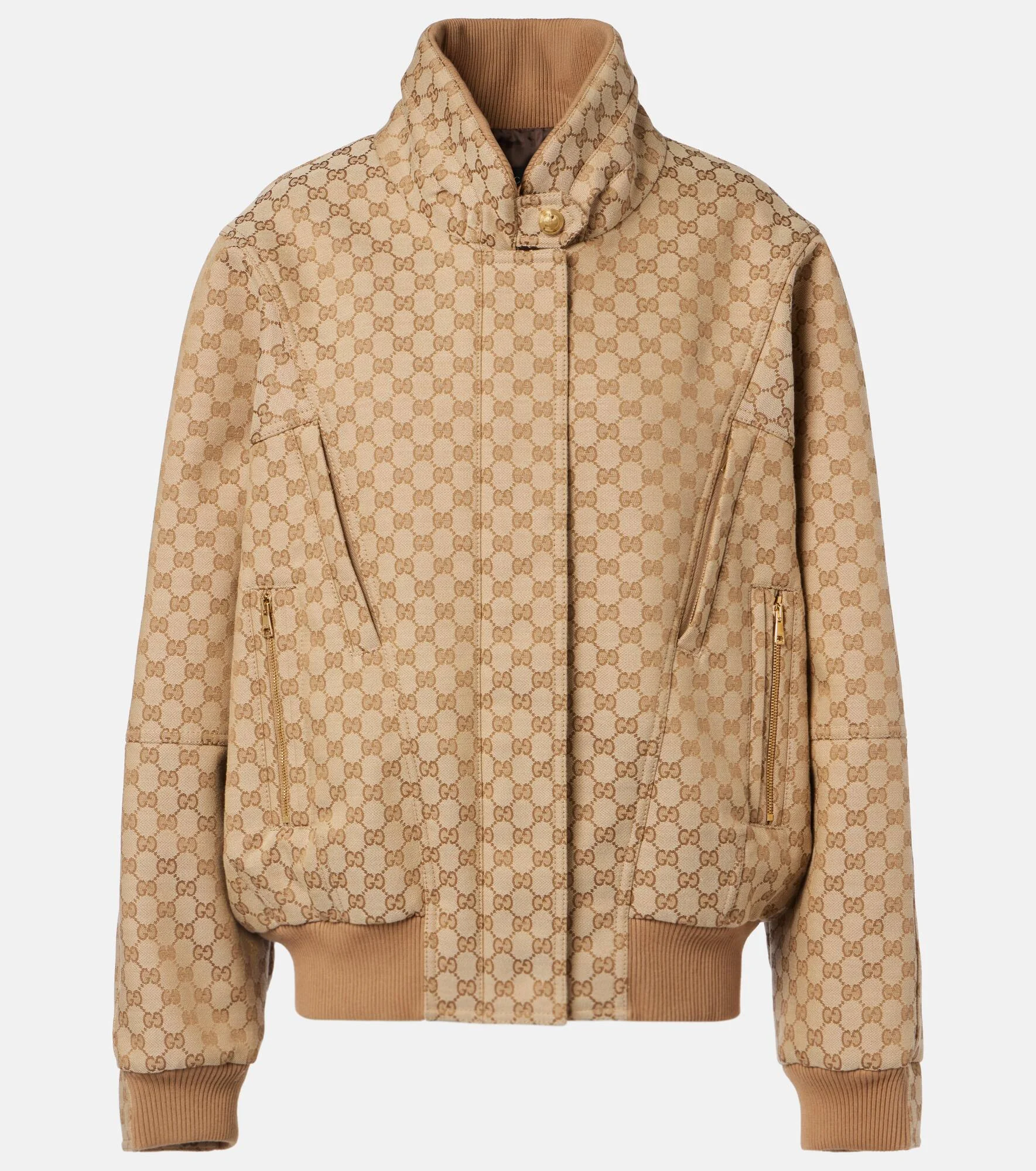 A historic interpretation of founder Guccio Gucci's initials, GG Canvas is a key fabric at the house of Gucci. It's used to make this jacket, a classic blouson style with zipper-fastened side slit pockets, ribbed-knit trims, and gold-toned hardware. Product Details - Material: 52% polyester, 24% cotton, 24% polyamide - Care instructions: dry clean - Made in Italy - Color: beige - Designer color name: Vintage Sand - Trim: 97% polyester, 3% elastane - Lining: 100% viscose - Filling: 100% polyester - Closure: zipper, snap-button fastenings - Pockets: zipped pockets - Cuff: ribbed, buttoned - Hem: ribbed - Item number: P01150125 Size & Fit - True to size - Designed for a loose fit - Elasticated hem - Non-stretchy fabric - Falls below the hip - The model seen in the picture is 178cm-5'10" and wearing a size IT 40