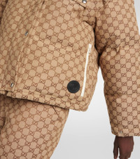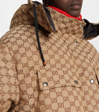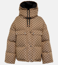 This puffer jacket from Gucci is made from GG cotton-blend canvas with an oval leather tag featuring the Interlocking G. This style has four pockets, a detachable hood, and down filling. Product Details - Filling: 10% goose feathers, 90% down - Lining II: 100% viscose - Lining: 100% polyamide - Care instructions: dry clean - Pockets: zipped pockets - Made in Italy - Material II: 100% polyamide - Designer color name: Camel/Mix - Contains non-textile parts of animal origin - Material: 29% polyester, 71% cotton - Closure: zipper, snap-button fastenings - Detachable hood - Item number: P00746186 Size & Fit - Fits large to size - we recommend trying one size smaller - Dropped shoulders - Adjustable hem - Oversized - Mid-weight material - Thick material - Falls to the hip - The model seen in the picture is 178cm-5'10" and wearing a size IT 38