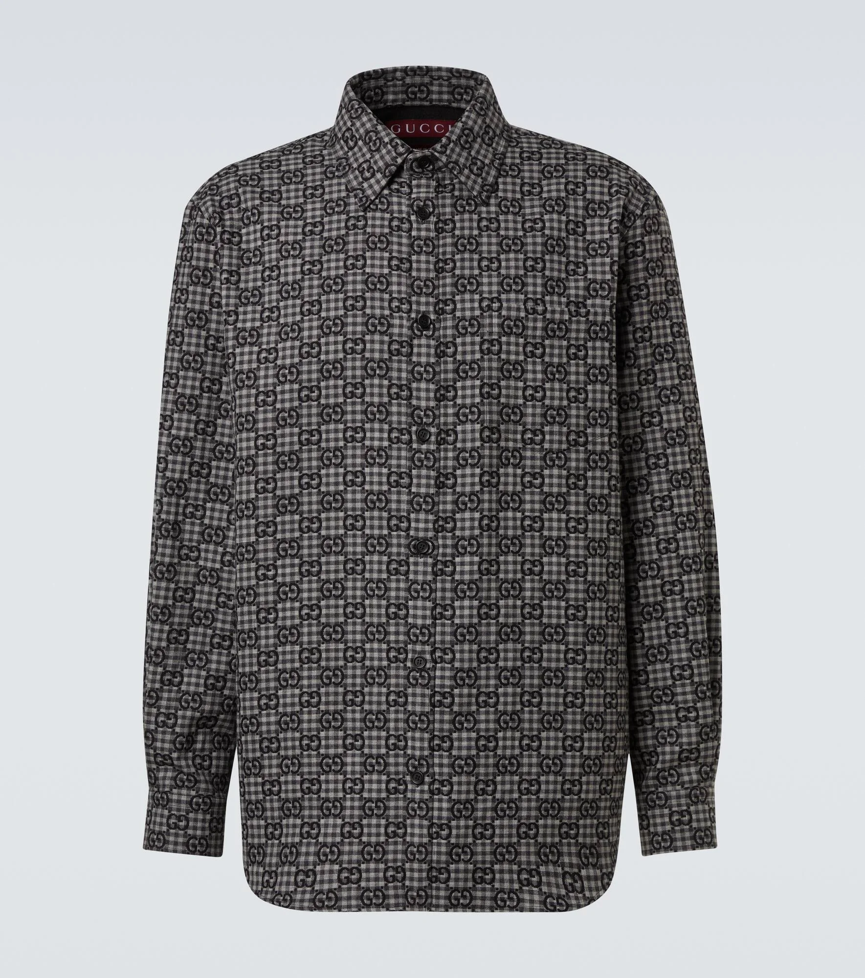 This shirt is Italian-crafted from wool and cotton with all-over checked patterning and brand-signature motif detailing. A historic interpretation of founder Guccio Gucci's initials, the GG emblem is key to the house of Gucci. Product Details - Material: 57% wool, 43% cotton - Care instructions: dry clean - Made in Italy - Designer color name: Grey/Dark Grey/Mc - Item color: gray - Collar: classic (Straight point) - Closure: buttoned front - Cuff: buttoned - Item number: P01050994 Size & Fit - True to size - With pleats in the back - Classic fit - Non-stretchy fabric - Falls below the hip - Height of model is 188cm-74" and wears a size IT 50