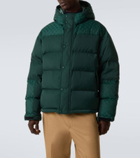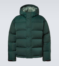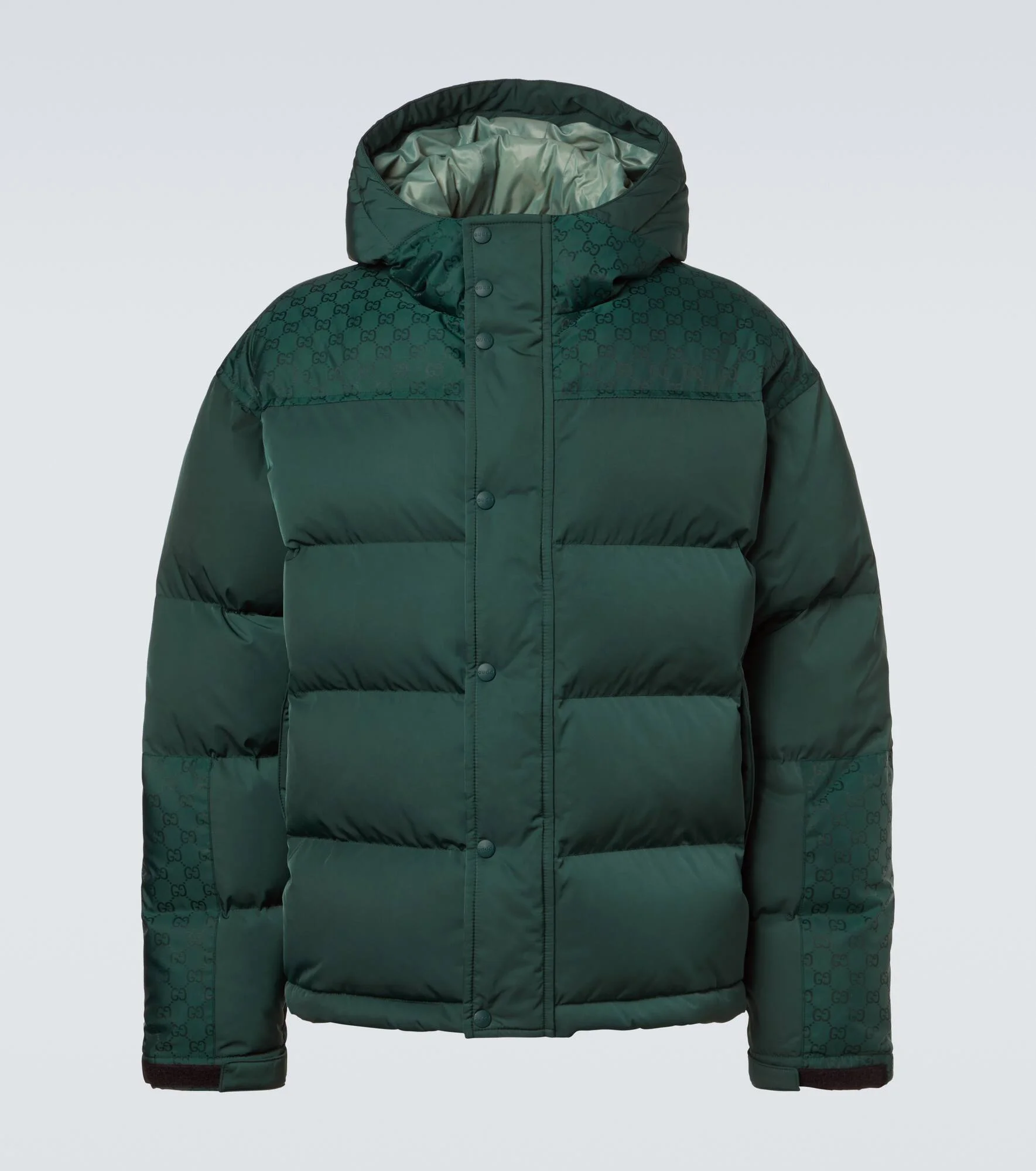 Gucci's collections are both a reflection of the past and a glimpse into the future. Crafted in Italy from green technical material with panels adorned by the brand's iconic GG pattern, this jacket is insulated with warm down and features a concealed zipper fastening with snap buttons. Product Details - Material: 100% polyester - Care instructions: dry clean - Made in Italy - Designer color name: Pine - Item color: green - Lining: 100% polyamide - Pocket lining: 100% cotton - Filling: 90% down, 10% goose feathers - Contains non-textile parts of animal origin - Pockets: zipped pockets, internal pocket - Closure: concealed zipped front, snap-buttoned front - Drawstring at the hem for adjustable fit - Cuff: tab cuff - Drawstring hood - Item number: P01124413 Size & Fit - Height of model is 192cm-75.5" and wears a size IT 50