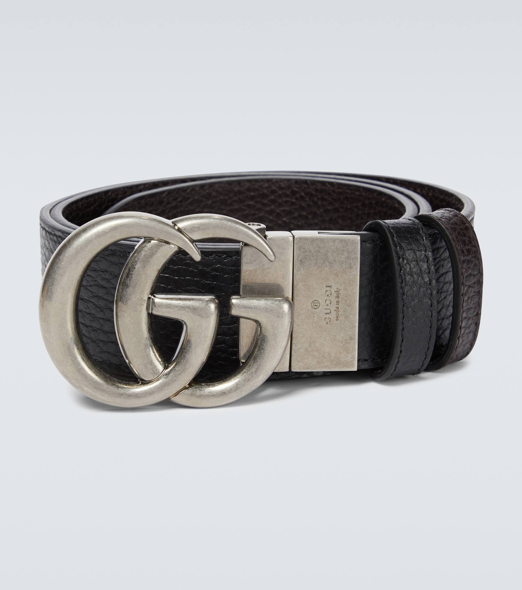 Crafted in Italy from leather, this black belt from Gucci features the label's double G buckle logo in antique silver, this style comes with punch holes for an adjustable fit. It is also reversible and comes in black and brown. Product Details - Color of fastening: antique silver - Material: calf leather - Comes with dust bag - Reversible - Made in Italy - Item number: P00583854 Size & Fit - Width 3,5cm-1.5" - Buckle width 5cm-2"