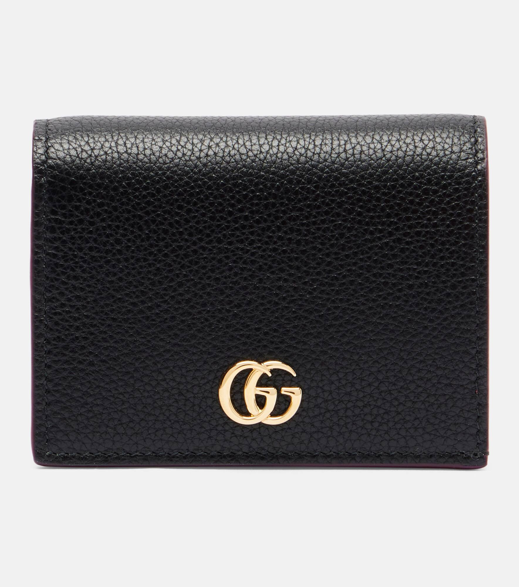 The GG Marmont wallet from Gucci is a refined expression of the maison’s unmistakable craftsmanship and expertise in leatherworking. This accessory boasts a gold-toned Double G and features practical slots and a zipped pouch. Product Details - Material: calf leather - Lining: calf leather - Made in Italy - Designer color name: Black/Rosso Ancora - Item color: black, burgundy - Hardware color: gold - Closure: snap-buttoned fastening - Internal details: Card slots, bill slot, internal zipped pouch - Includes: dust bag, box - Item number: P01054680 Size & Fit - Height 8,5cm-3.5" - Width 11cm-4.5" - Depth 2,5cm-1"