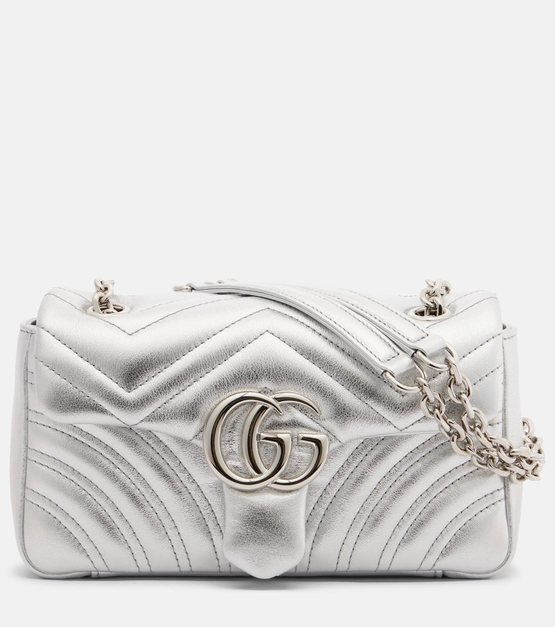 Let Gucci's GG Marmont shoulder bag be the focal point of your ensembles. Made from metallic leather with quilting throughout, the design comes with a detachable chain shoulder strap. Product Details - Material: lamb leather - Lining: fabric, leather - Made in Italy - Designer color name: Silver - Item color: silver - Adjustable chain and leather shoulder strap - Internal details: internal slot pocket - Closure: push-lock fastening - Includes: dust bag - Item number: P01117995 Size & Fit - Height 12,5cm-5" - Max. width 22cm-8.5" - Depth 6cm-2.5" - Min. chain length 59cm-23" - Max. chain length 111cm-43.5"