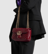 This GG Marmont shoulder bag from Gucci is crafted from leather and defined by distinct quilted stitching throughout. The Small-sized design is presented in a structured compact silhouette, showcasing gold-toned Double G hardware on the front flap. Product Details - Material: lamb leather - Lining: fabric - Made in Italy - Designer color name: Rosso/Ancora - Item color: burgundy - Hardware color: gold - Closure: push-lock fastening - Adjustable chain and leather shoulder strap - Internal details: internal slot pocket - Includes: dust bag - Item number: P01132881 Size & Fit - Height 13cm-5" - Width 21cm-8.5" - Depth 6cm-2.5" - Chain length 65/113cm-25.5/44.5"