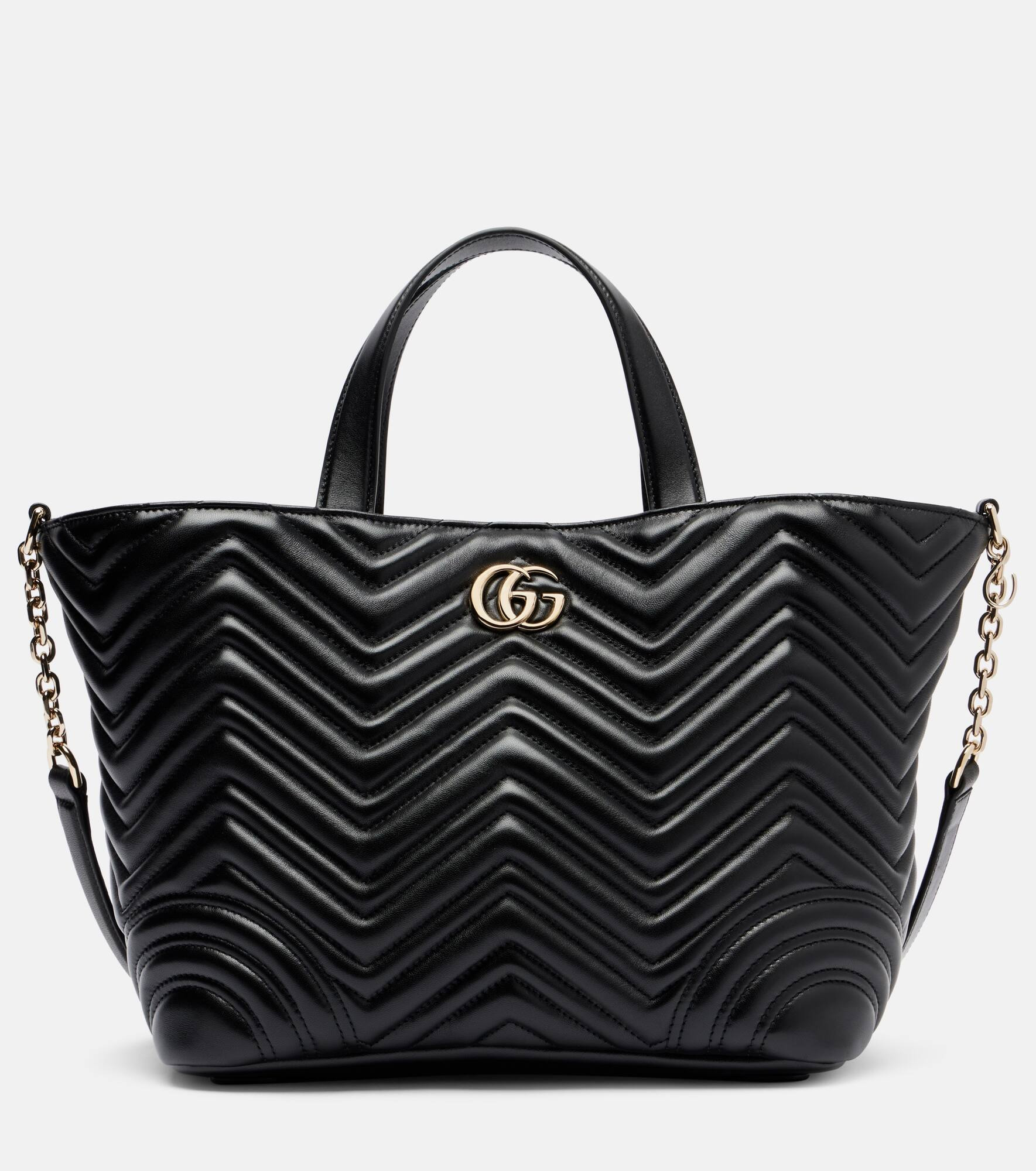 Gucci's GG Marmont Small tote bag is crafted in Italy from leather and shaped with softly structured lines. The design is finished with the archival GG motif, a distinctive symbol of the house. Product Details - Material: lamb leather - Lining: fabric, leather - Made in Italy - Designer color name: Black - Item color: black - Hardware color: gold - Top handles, Chain and leather shoulder strap - Closure: magnetic-tab fastening - Internal details: internal zipped pocket - Includes: dust bag - Item number: P01095574 Size & Fit - Height 23cm-9" - Width 40cm-15.5" - Depth 15cm-6" - Length of handles 31cm-12" - Adjustable shoulder strap - Max. length shoulder strap 115cm-45.5"