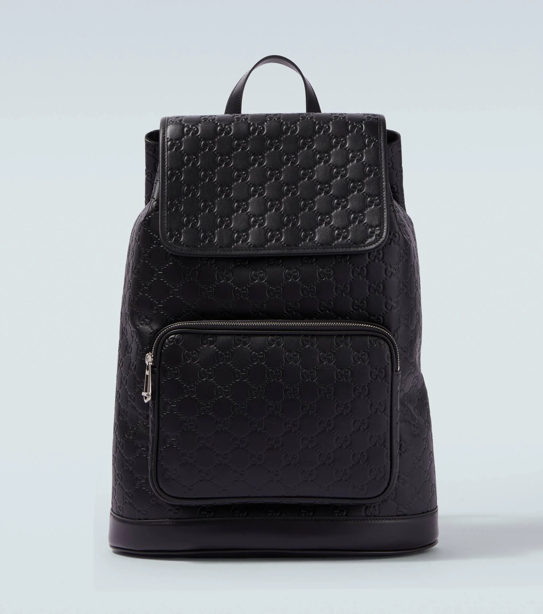 Embrace on-the-go sophistication with this Medium backpack from Gucci. Crafted from GG-embossed leather, this sleek design features adjustable shoulder straps, a zipped pocket on the front, and drawstring top closure. Product Details - Material: calf leather - Lining: fabric - Made in Italy - Designer color name: Blk/Blk/Bl/B/B/Vrv/B - Item color: black - Trim: leather - Hardware color: silver - Top handle, Adjustable shoulder straps - Internal details: internal slot pocket, single compartment - Closure: drawstring top, magnetic fastening - Zipped front pocket - Includes: dust bag - Item number: P01124341 Size & Fit - Height 45cm-17.5" - Width 31cm-12" - Depth 12cm-4.5" - Length of handle 21cm-8.5" - Adjustable shoulder strap - Min. length shoulder strap 59cm-23" - Max. length shoulder strap 97cm-38"