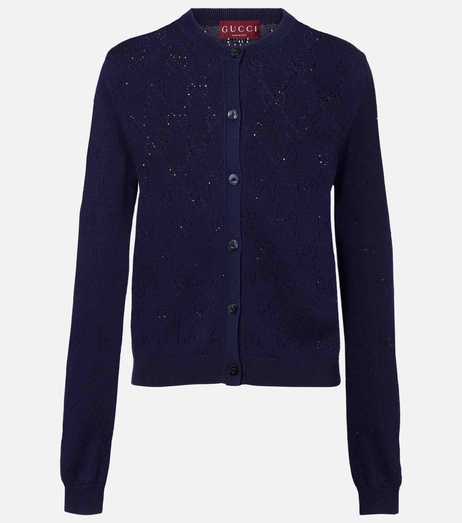 Add this cardigan from Gucci to your elegant knitwear repertoire. Expertly made from sumptuous silk and cotton, the style is complete with an exquisite GG pointelle detailing. Product Details - Material: 55% silk, 45% cotton - Care instructions: dry clean - Made in Italy - Color: blue - Designer color name: Classic Blue - Details: 54% silk, 44% cotton, 1% elastane, 1% polyamide - Contains non-textile parts of animal origin - Closure: buttoned front - Cuff: ribbed - Hem: ribbed - Item number: P01119174 Size & Fit - True to size - Straight fit - Stretchy fabric - Falls to the hip - The model seen in the picture is 178cm-5'10" and wearing a size XS