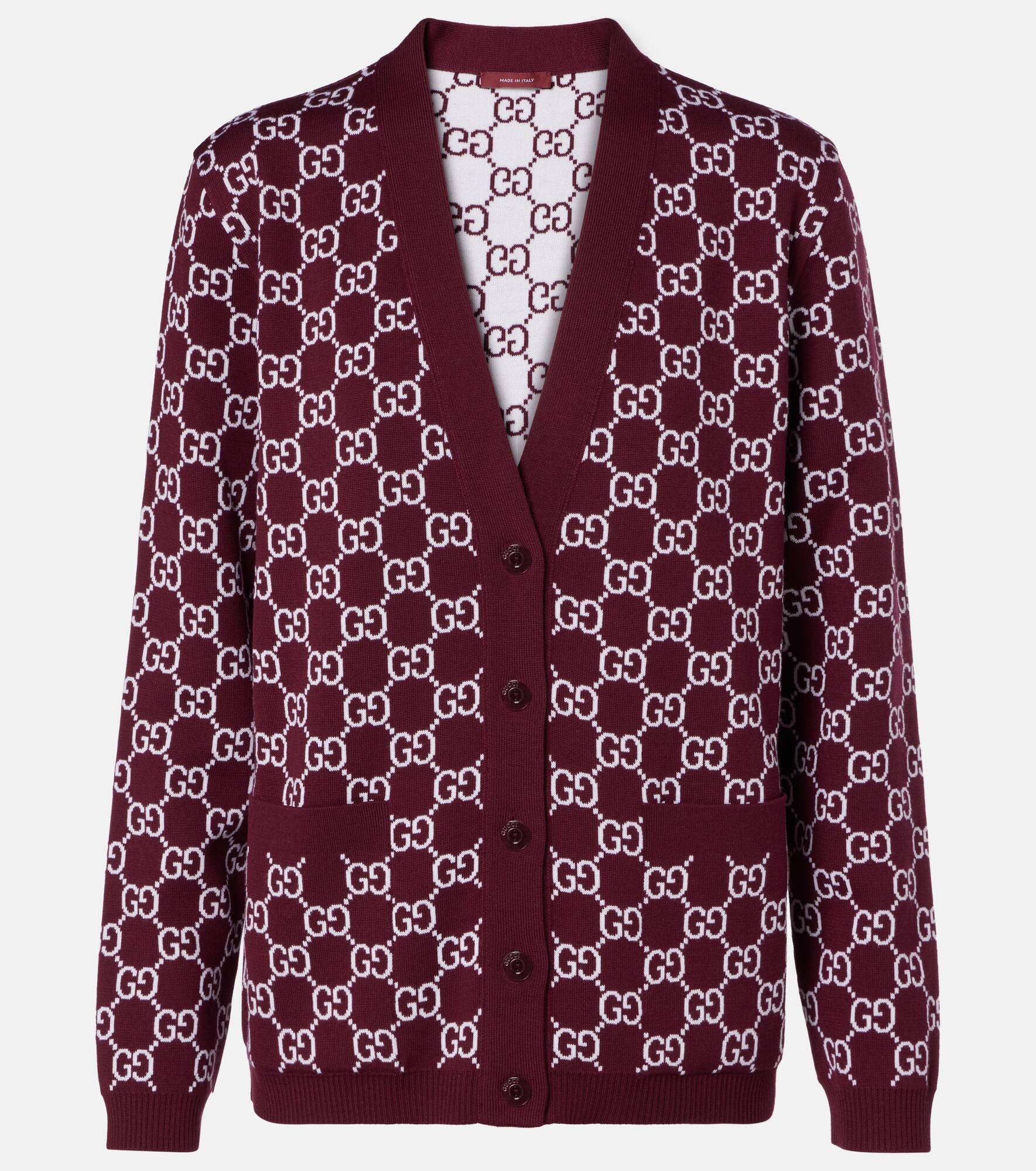 Crafted from a wool-blend, this cardigan from Gucci features a reversible style with a ribbed hem and patch pockets. The design is finished with the GG pattern stitched in jacquard all over. Product Details - Material: 96% wool, 3% polyamide, 1% elastane - Care instructions: dry clean - Made in Italy - Designer color name: Bordeaux/White - Item color: burgundy - Trim: 100% wool - Contains non-textile parts of animal origin - Closure: buttoned front - Pockets: patch pockets - Hem: ribbed - Item number: P01082857 Size & Fit - True to size - Dropped shoulders - Designed for a loose fit - Slightly stretchy fabric - Falls below the hip - The model seen in the picture is 178cm-5'10" and wearing a size XS