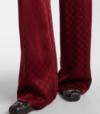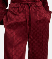 An iconic name within fashion on a global scale, Gucci redefines luxury and pursues its commitment to excellence and creativity. These wide-leg pants are Italian-crafted from lustrous satin and detailed with the brand's signature GG pattern. Product Details - Material: 55% viscose, 45% acetate - Care instructions: dry clean - Made in Italy - Designer color name: Rosso Ancora/Mix - Item color: burgundy - Trim: 60% acetate, 30% silk, 10% viscose - Pocket lining: 75% acetate, 25% silk - Elasticated drawstring waist - Closure: zipper fly, button fastening - Pockets: side slit pockets, back pockets - Item number: P01052887 Size & Fit - True to size - Adjustable at the waist - Non-stretchy fabric - Wide-leg - The model seen in the picture is 178cm-5'10" and wearing a size IT 40