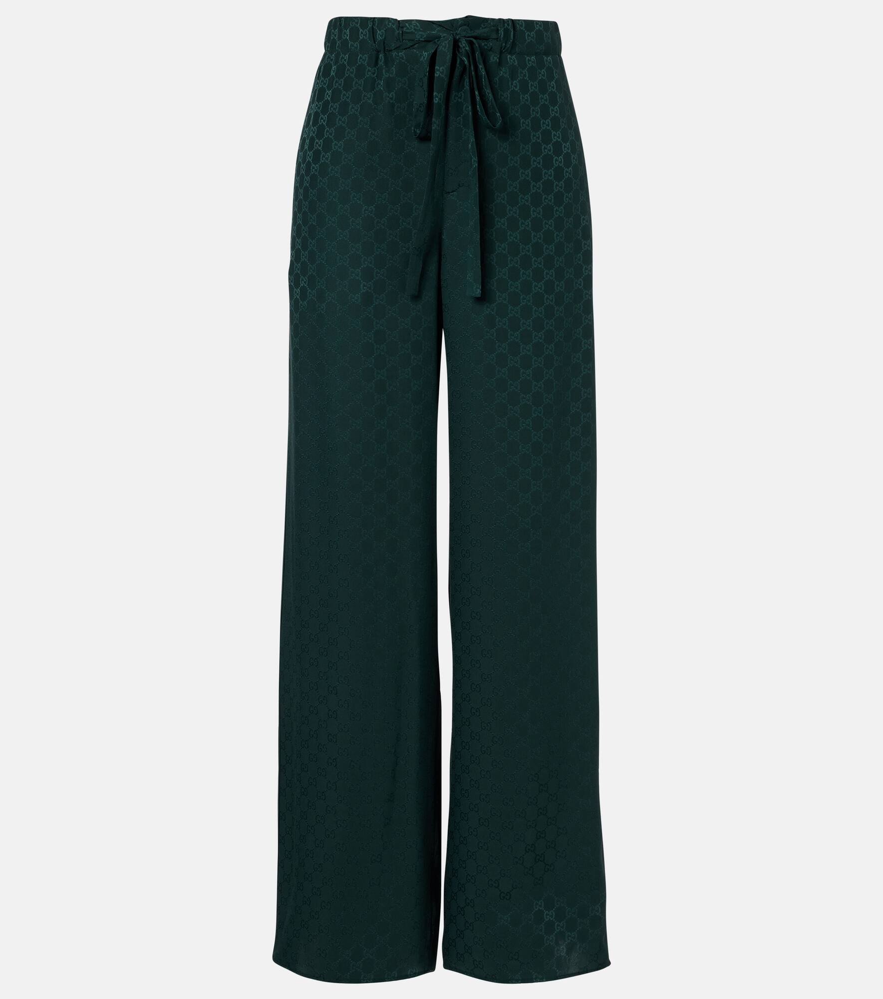 Gucci presents an elevated take on casual style with these wide-leg pants. Cut from silk and detailed in an all-over GG jacquard pattern, the design ensures a comfortable fit with an elasticated drawstring waist. Product Details - Material: 100% silk - Care instructions: dry clean - Made in Italy - Designer color name: Dark Bottle Green - Item color: green - Details: 60% acetate, 30% silk, 10% viscose - Pocket lining: 75% acetate, 25% silk - Contains non-textile parts of animal origin - Elasticated drawstring waist - Pockets: side slit pockets, back pockets - Closure: zipper fly, button fastening - Item number: P01088154 Size & Fit - True to size - Elasticated waist - Adjustable at the waist - Non-stretchy fabric - Wide-leg - High-waisted - The model seen in the picture is 178cm-5'10" and wearing a size IT 40