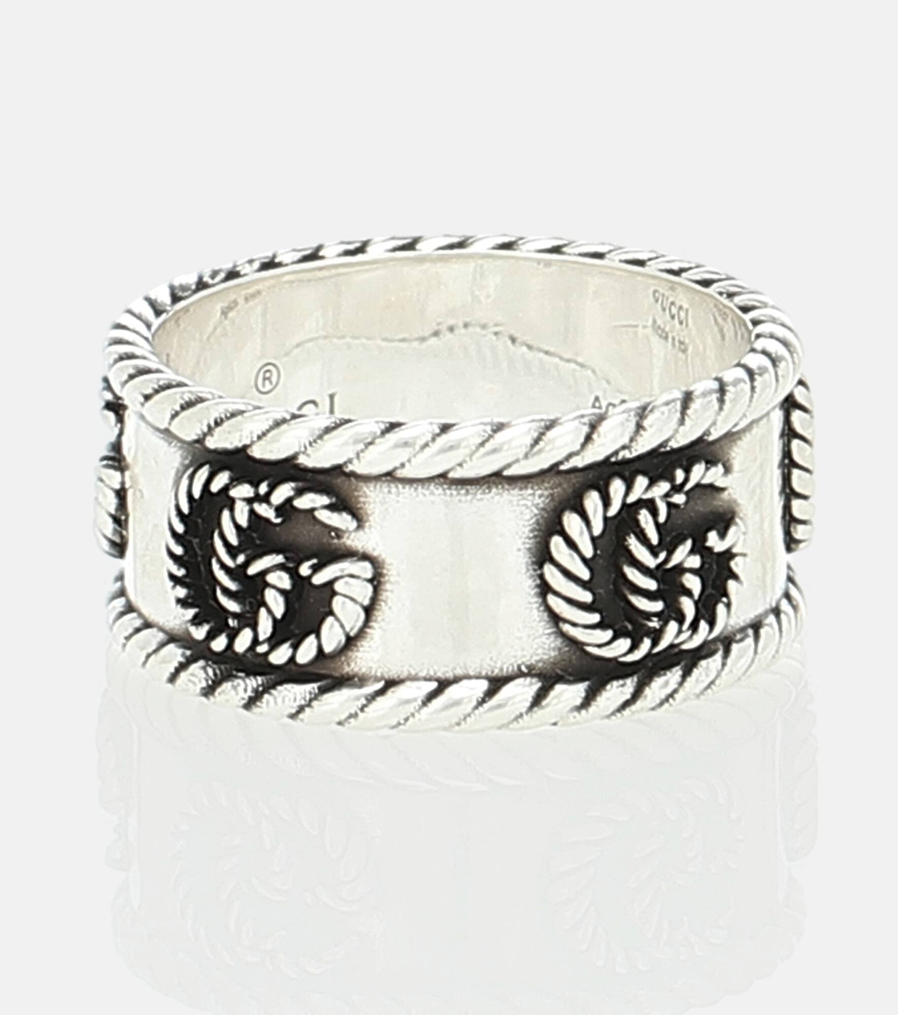 Drawing inspiration from their iconic belt buckles, this ring from Gucci features engraved GG motifs. The distinctive design is framed by an engraved woven design and an antique effect is used throughout to add depth to the piece. Product Details - Material: 925 sterling silver - Made in Italy - Designer color name: Silver - Item number: P00470630 Size & Fit - Width 9mm-0.35"