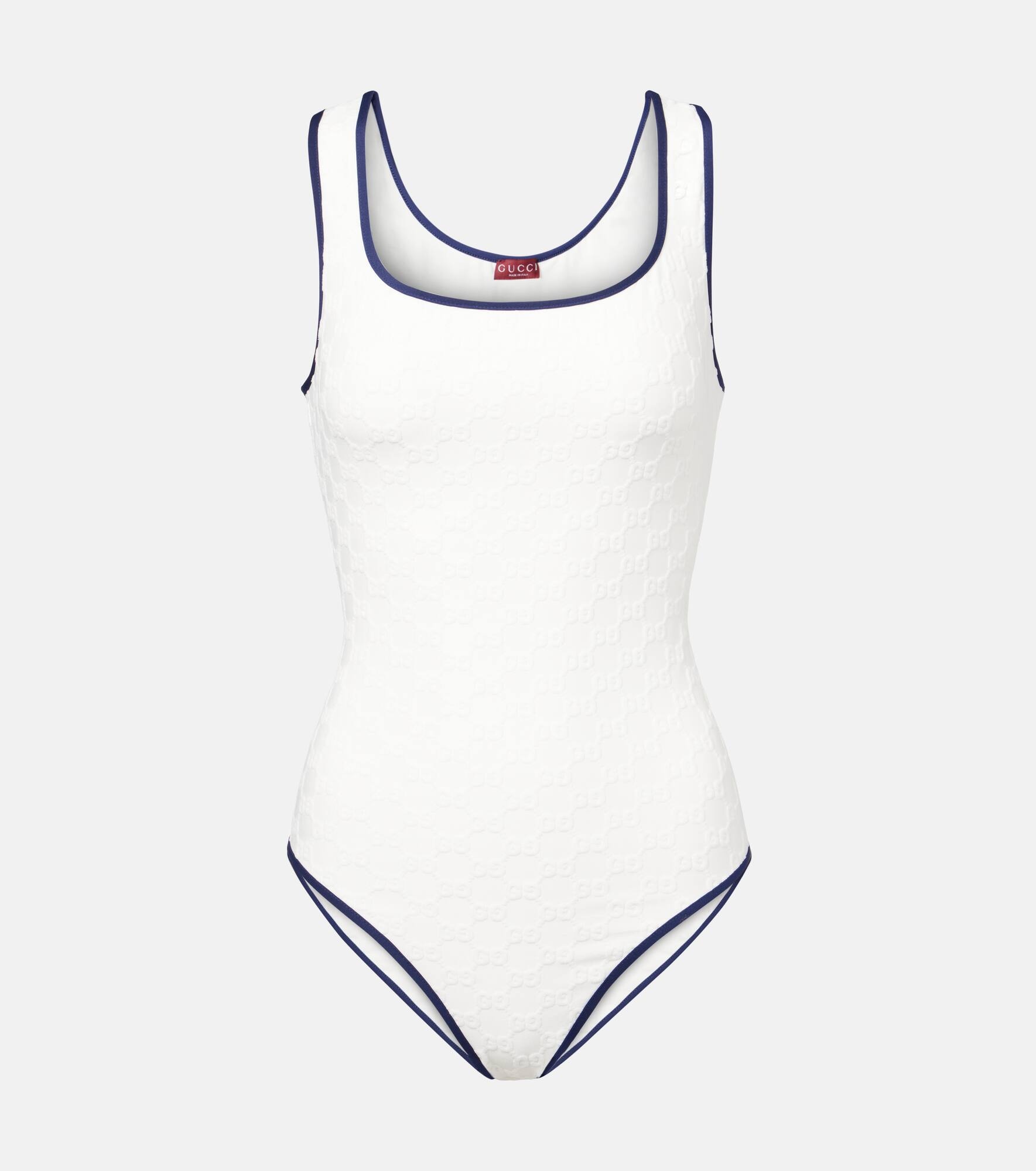 This swimsuit from Gucci deserves a spot in your getaway suitcase. Made from terry jersey, the style is complete with high-cut legs, contrasting trims, and an all-over GG pattern for a signature finish. Product Details - Material: 95% polyamide, 5% elastane - Care instructions: hand wash - Made in Italy - Designer color name: White/Blue - Item color: white - Item number: P01004286 Size & Fit - Fits large to size - we recommend trying one size smaller - Unpadded Top - Medium-cut leg - The model seen in the picture is 178cm-5'10", cup size B, and wearing a size XS