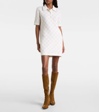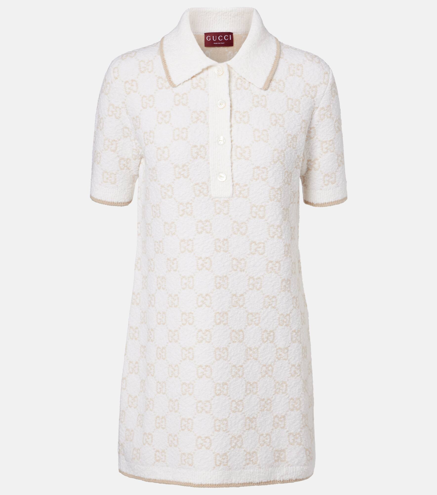 Renowned for its playful yet sophisticated aesthetic, Gucci continues to define contemporary style. Crafted in Italy from a wool blend, this minidress features the iconic GG pattern, a polo collar, ribbed trims, and a buttoned placket. Product Details - Material: 80% wool, 11% polyamide, 5% cashmere, 3% polyester, 1% elastane - Care instructions: dry clean - Made in Italy - Designer color name: White/Beige - Item color: white, beige - Trim: 76% wool, 18% polyamide, 4% polyester, 1% elastane, 1% cashmere - Details: 76% wool, 19% polyamide, 4% polyester, 1% elastane - Contains non-textile parts of animal origin - Collar: polo collar - Closure: buttoned placket - Cuff: ribbed - Hem: ribbed - Item number: P01052730 Size & Fit - True to size - Straight fit - Stretchy fabric - The model seen in the picture is 178cm-5'10" and wearing a size XS
