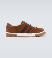 Debuted in 1951, Gucci's signature green and red Web Stripe was inspired by equestrian saddle straps. The iconic code is featured on the sides of the Gucci Ace sneakers, crafted from suede to a low-top silhouette. Product Details - Upper: calf leather (suede) - Lining: leather - Sole: leather insole and sole - Toe shape: round toe - Made in Italy - Includes: dust bag, extra laces, shoe box - Designer color name: Pepper Brown/VRV/P.B. - Item color: brown, multicolor - Closure: lace-up - Hardware color: antique silver - Item number: P01124396 Size & Fit - True to size - UK sizes