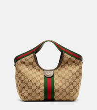 A historic interpretation of founder Guccio Gucci's initials, GG Supreme canvas is a key fabric at the house of Gucci. The Gucci Giglio tote bag is made in Italy from the signature material. Product Details - Material: canvas - Lining: cotton - Made in Italy - Designer color name: Camel Eb.Ve/N.Ac/Vrv - Item color: beige, brown - Internal details: single compartment, internal zipped pouch - Closure: magnetic fastening - Hardware color: gold - Includes: dust bag - Top handles, Detachable shoulder strap - Item number: P01106603 Size & Fit - Min. height 17cm-6.5" - Max. height 26cm-10" - Max. width 37cm-14.5" - Depth 14cm-5.5" - Length of handle 20cm-8" - Adjustable shoulder strap - Length shoulder strap 111cm-43.5" - Min. length shoulder strap 131cm-51.5" - Clutch height 13cm-5" - Clutch width 21cm-8.5"