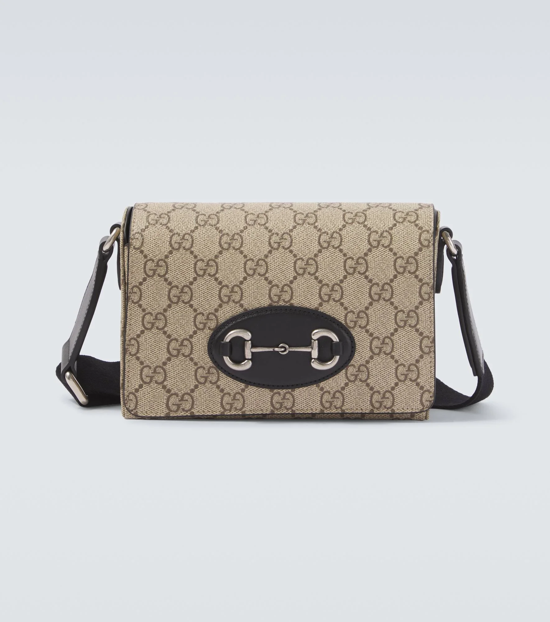 Detailed with brand-signature motifs, the Gucci Horsebit 1955 Mini shoulder bag features leather trims and an adjustable shoulder strap. A historic interpretation of founder Guccio Gucci's initials, the GG pattern is key to the house of Gucci. Product Details - Material: fabric - Lining: leather, fabric - Made in Italy - Color: black - Designer color name: B.Ebony/Black/Black - Trim: leather - Adjustable shoulder strap - Internal details: single compartment, Card slots - Closure: magnetic fastening - Hardware color: silver - Includes: box, dust bag - Item number: P01124368 Size & Fit - Height 13cm-5" - Width 18,5cm-7.5" - Depth 5,5cm-2" - Adjustable shoulder strap - Min. length shoulder strap 84cm-33" - Max. length shoulder strap 140cm-55"