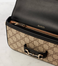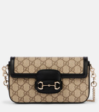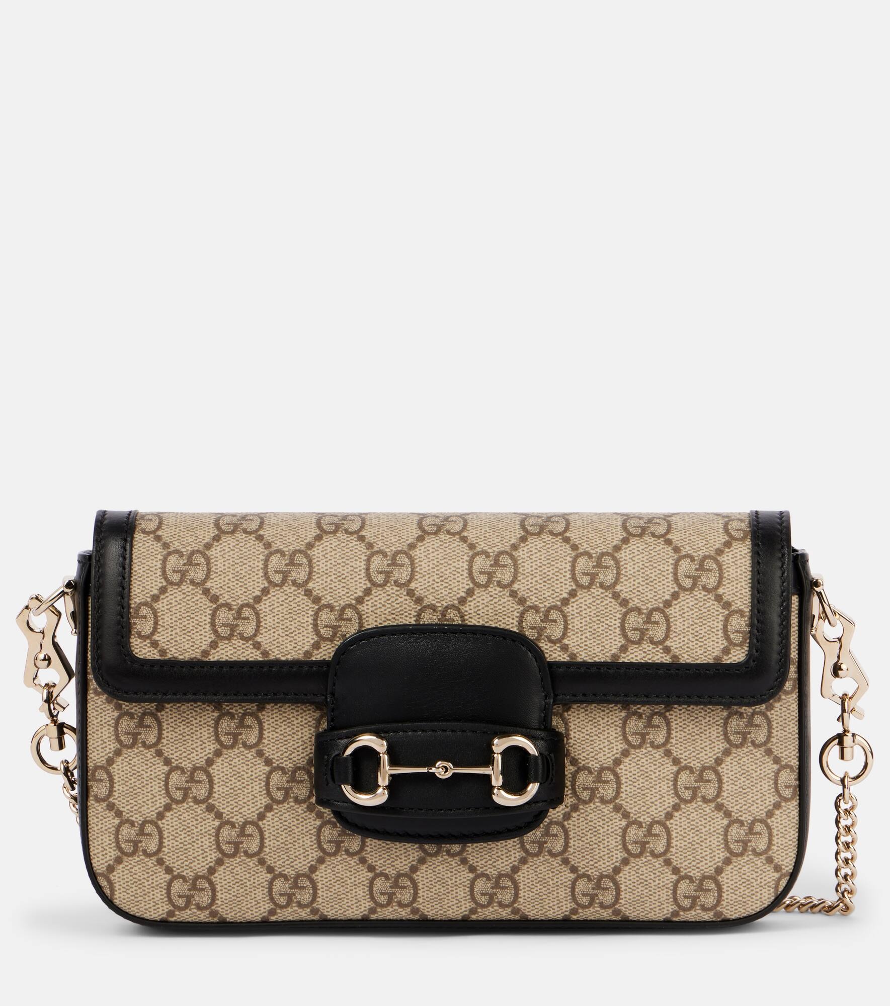 One of Gucci's most powerful emblems, the Horsebit points to the house's storied fascination with equestrian design codes. The motif features prominently on the Gucci Horsebit 1955 Small shoulder bag expertly crafted from new, coated GG canvas – yet another brand icon. Product Details - Material: fabric - Lining: leather - Made in Italy - Designer color name: Be Ebony/Black - Item color: brown, black - Trim: leather - Hardware color: gold - Closure: slot-tab fastening - Internal details: internal slot pocket, Card slots, internal zipped pocket - Detachable chain shoulder strap - Item number: P01068849 Size & Fit - Height 12,5cm-5" - Width 21,5cm-8.5" - Depth 3cm-1" - Chain length 43cm-17"
