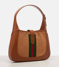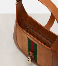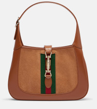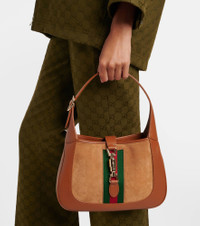 The Jackie 1961 Medium shoulder bag embodies Gucci's emblems, featuring the signature piston closure and the iconic Web Stripe. This piece is crafted from suede and leather and comes with an adjustable top handle. Product Details - Material: leather (suede), calf leather - Lining: leather - Made in Italy - Designer color name: Sundial/Sundial/Vrv - Item color: brown - Hardware color: gold - Internal details: internal zipped pocket - Closure: push-lock fastening - Adjustable top handle, Detachable shoulder strap - Item number: P01054660 Size & Fit - Height 18cm-7" - Max. width 27cm-10.5" - Depth 5cm-2" - Length of handle 46cm-18" - Adjustable shoulder strap - Min. length shoulder strap 97cm-38" - Max. length shoulder strap 117cm-46"