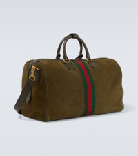 Travel in style with the Gucci Savoy Medium duffel bag from Gucci. Crafted from supple suede, the versatile design features the house's signature Web Stripe, Double G hardware, and a detachable Liftboy ID tag. Product Details - Material: leather (suede) - Lining: fabric - Made in Italy - Color: green - Designer color name: Lusc.Gr/Lusc.Gr/Vrv - Item color: green - Hardware color: gold - Top handles, Detachable shoulder strap - Internal details: internal zipped pocket, single compartment - Closure: two-way zipped top - Detachable charm - Includes: dust bag - Item number: P01078852 Size & Fit - Height 26cm-10" - Width 45.5cm-18" - Depth 24cm-9.5" - Length of handles 37cm-14.5" - Adjustable shoulder strap - Min. length shoulder strap 113cm-44.5" - Max. length shoulder strap 129cm-51"