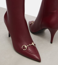 Crafted from supple leather, these ankle boots from Gucci embody the brand's heritage, long defined by elegance and craftsmanship. This pair features a sharp pointed toe, 95mm stiletto heels and the maison's signature Horsebit emblem. Product Details - Upper: leather - Lining: leather - Sole: leather insole and sole - Toe shape: pointed toe - Made in Italy - Includes: shoe box - Designer color name: Rosso Ancora - Item color: burgundy - Hardware color: gold - Closure: zipped side - Item number: P01062963 Size & Fit - True to size - European sizes - 9,5cm-3.5" heel (size EU 38)
