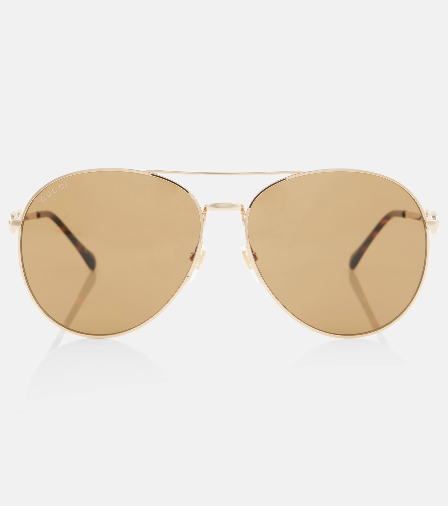 One of Gucci's most powerful emblems, the Horsebit points to the house's storied fascination with equestrian design codes. Crafted from golden metal frames, these sunglasses feature an aviator design and light brown lenses. Product Details - Frame material: metal - Frame color: gold - Lens filter category 3 - Lens color: light brown - Made in Italy - Includes: hard case - The color of the case may vary - Item number: P00977684 Size & Fit - Lens width: 60mm-2.35" - Bridge size: 14mm-0.55" - Earpiece length: 140mm-5.5"