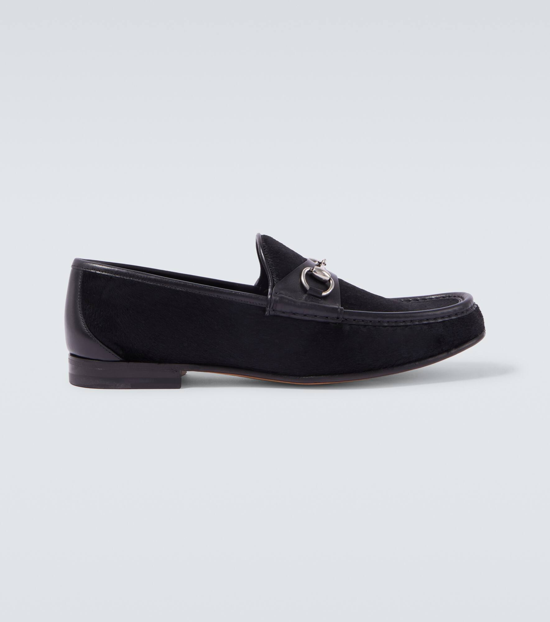 One of Gucci's most powerful emblems, the Horsebit points to the house's storied fascination with equestrian design codes. Crafted in Italy from soft calf hair, these loafers are finished with leather heels and upper straps. Product Details - Upper: calf hair - Lining: fabric - Sole: leather insole and sole - Toe shape: round toe - Made in Italy - Includes: shoe box - Designer color name: Black/Black - Item color: black - Hardware color: brass - Item number: P01050990 Size & Fit - True to size - UK sizes