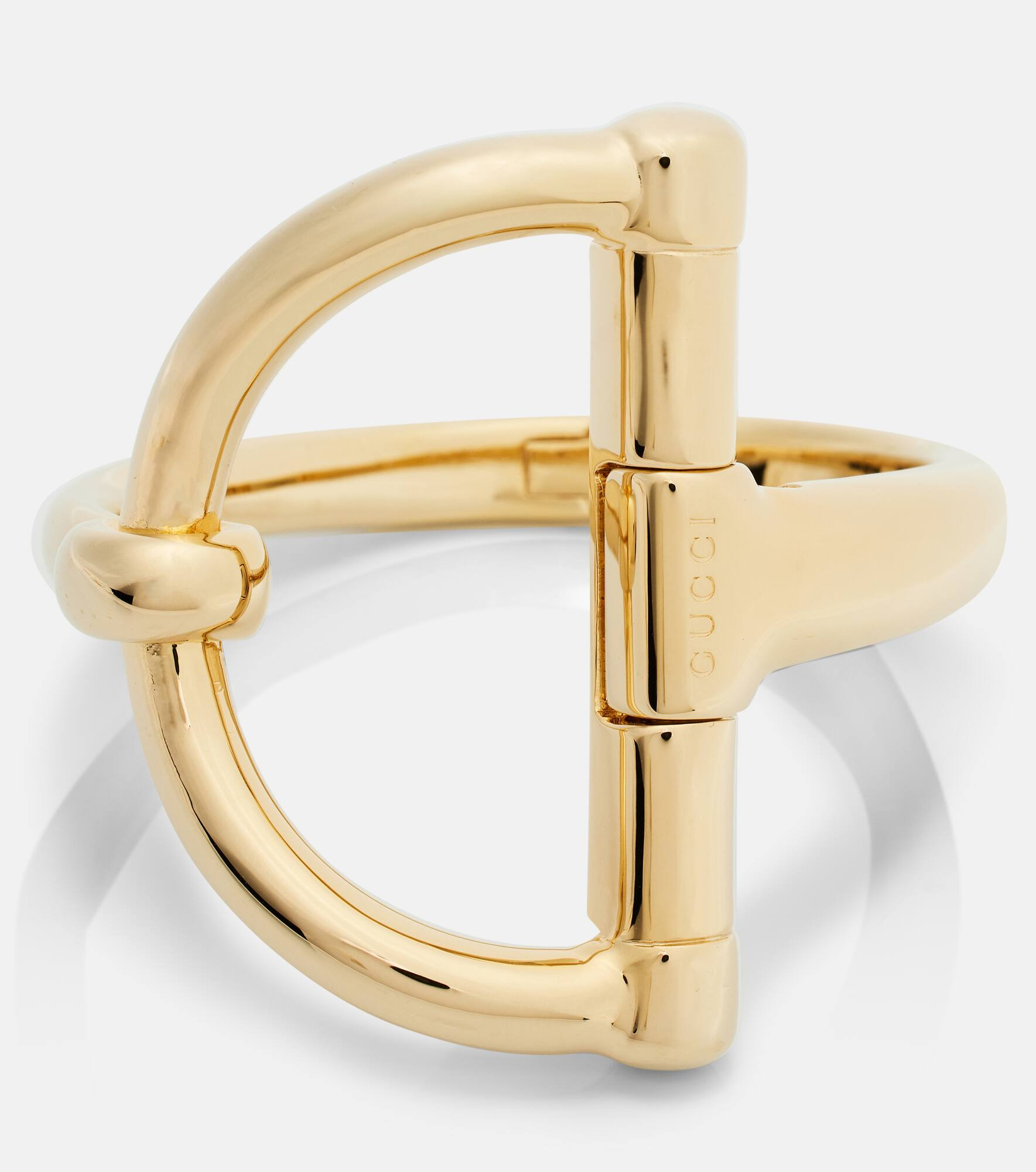 One of Gucci's most powerful emblems, the Horsebit points to the house's storied fascination with equestrian design codes. Made from gold-toned brass, the Horsebit bracelet features the motif as a design detail for a statement look. Product Details - Material: brass - Made in Italy - Item color: gold - Item number: P01095559 Size & Fit - Max. width 5,5cm-2" - Circumference size S 17,5cm-7" - Circumference size M 18,5cm-7.5" - Opening size M= 3,1cm-1"