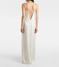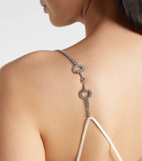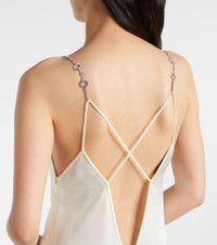 Coming with sparkling, crystal-embellished Horsebit straps, this dress is cut from luminous satin to a classic slip silhouette. One of Gucci's most powerful emblems, the Horsebit points to the house's storied fascination with equestrian design codes. Product Details - Material: 77% acetate, 23% viscose - Care instructions: dry clean - Made in Italy - Designer color name: Almond - Item color: white - Insert: 50% metal, 50% glass - Hardware color: silver - Item number: P01119091 Size & Fit - True to size - Low back - Designed for a loose fit - Non-stretchy fabric - Please note: small cups - slit length 72cm-28.5" - Height of model is 177cm-69.5" and wears a size IT 40