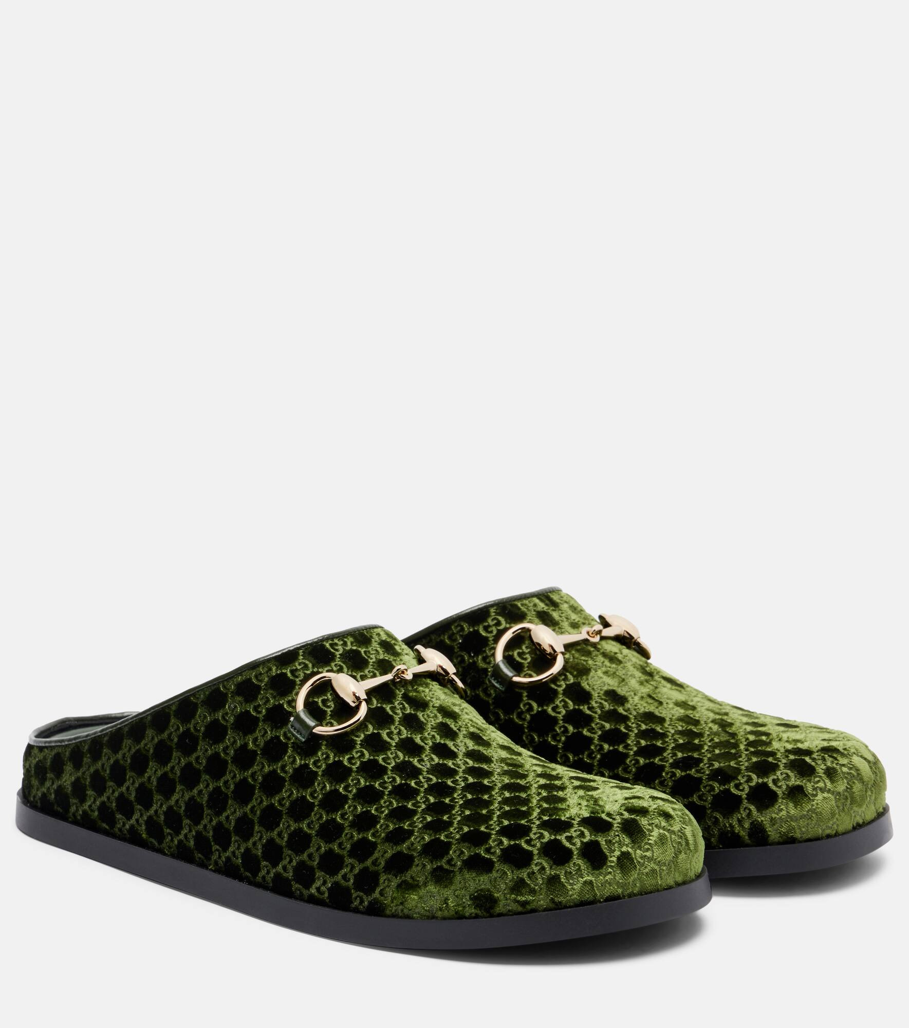 Gucci's Horsebit GG velvet mules are crafted in Italy with a classic round toe. The design showcases the iconic Horsebit hardware, a signature detail that speaks to the brand’s equestrian heritage. Product Details - Upper: fabric - Lining: leather - Sole: leather insole, rubber sole - Toe shape: round toe - Made in Italy - Includes: dust bags, shoe box - Designer color name: Verde Bosco/Ve.Bosco - Item color: green - Hardware color: gold - Item number: P01063075 Size & Fit - Fits slightly large to size - we recommend trying a half size smaller - European sizes - 2cm-1" platform (size EU 38)