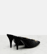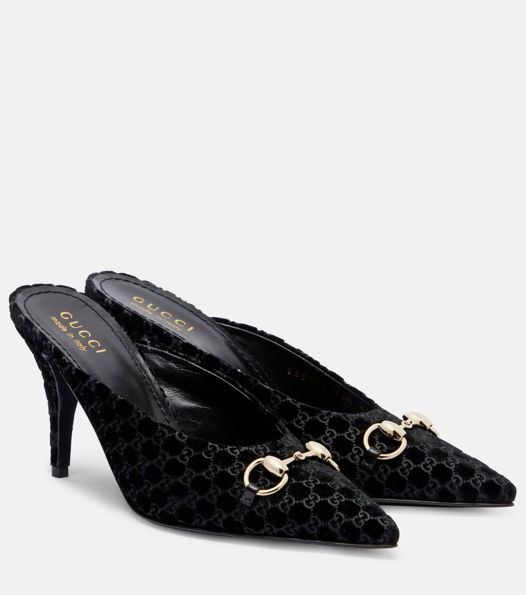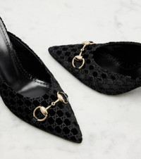 Italian-crafted from plush velvet, these mules feature the brand's signature GG patterning and are topped with iconic hardware. One of Gucci's most powerful emblems, the Horsebit points to the house's storied fascination with equestrian design codes. Product Details - Upper: fabric - Lining: leather - Sole: leather insole and sole - Toe shape: pointed toe - Made in Italy - Includes: shoe box, dust bags - Designer color name: Black/Black - Item color: black - Hardware color: gold - Item number: P01062964 Size & Fit - True to size - European sizes - 8,5cm-3.5" heel (size EU 38)