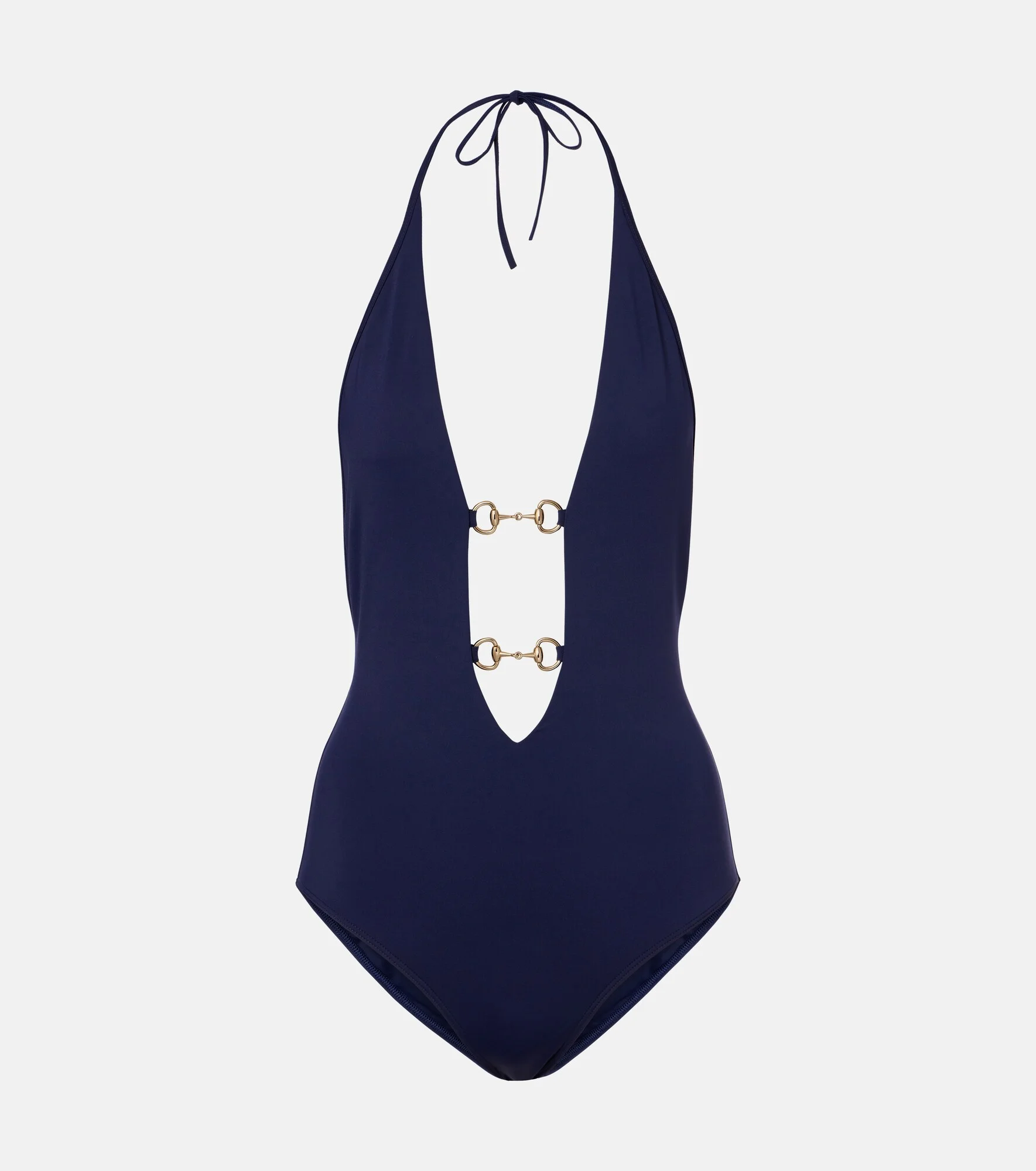 One of Gucci's most powerful emblems, the Horsebit points to the house's storied fascination with equestrian design codes. This swimsuit is defined by the brand's signature hardware and features a self-tie halterneck. Product Details - Material: 82% polyamide, 18% elastane - Care instructions: hand wash - Made in Italy - Color: blue - Designer color name: ClassicBlue - Closure: self-ties - Includes: dust bag - Item number: P01119295 Size & Fit - True to size - Unpadded Top - Medium-cut leg - The model seen in the picture is 178cm-5'10", cup size B, and wearing a size XS