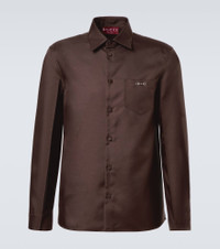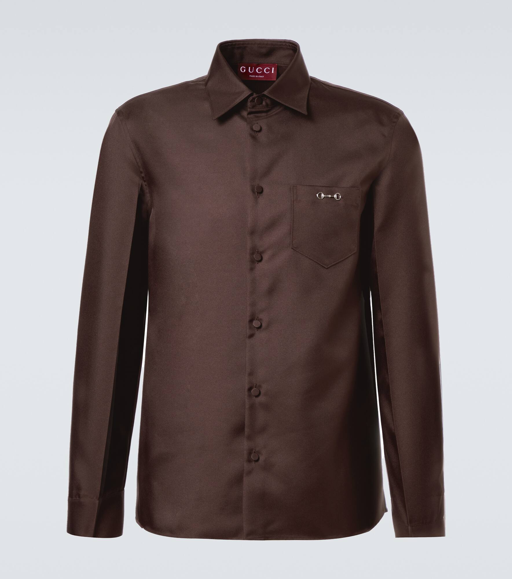 This refined shirt features a classic point collar, buttoned front, and iconic hardware at the chest patch pocket. One of Gucci's most powerful emblems, the Horsebit points to the house's storied fascination with equestrian design codes. Product Details - Material: 100% polyester - Care instructions: dry clean - Made in Italy - Designer color name: Blackish Brown - Item color: brown - Closure: buttoned front - Collar: classic (Straight point) - Pockets: breast pocket - Cuff: buttoned - Hardware color: silver - Item number: P01078834 Size & Fit - True to size - Without pleats in the back - Classic fit - Non-stretchy fabric - Falls below the hip - Height of model is 189cm-74.5" and wears a size IT 50