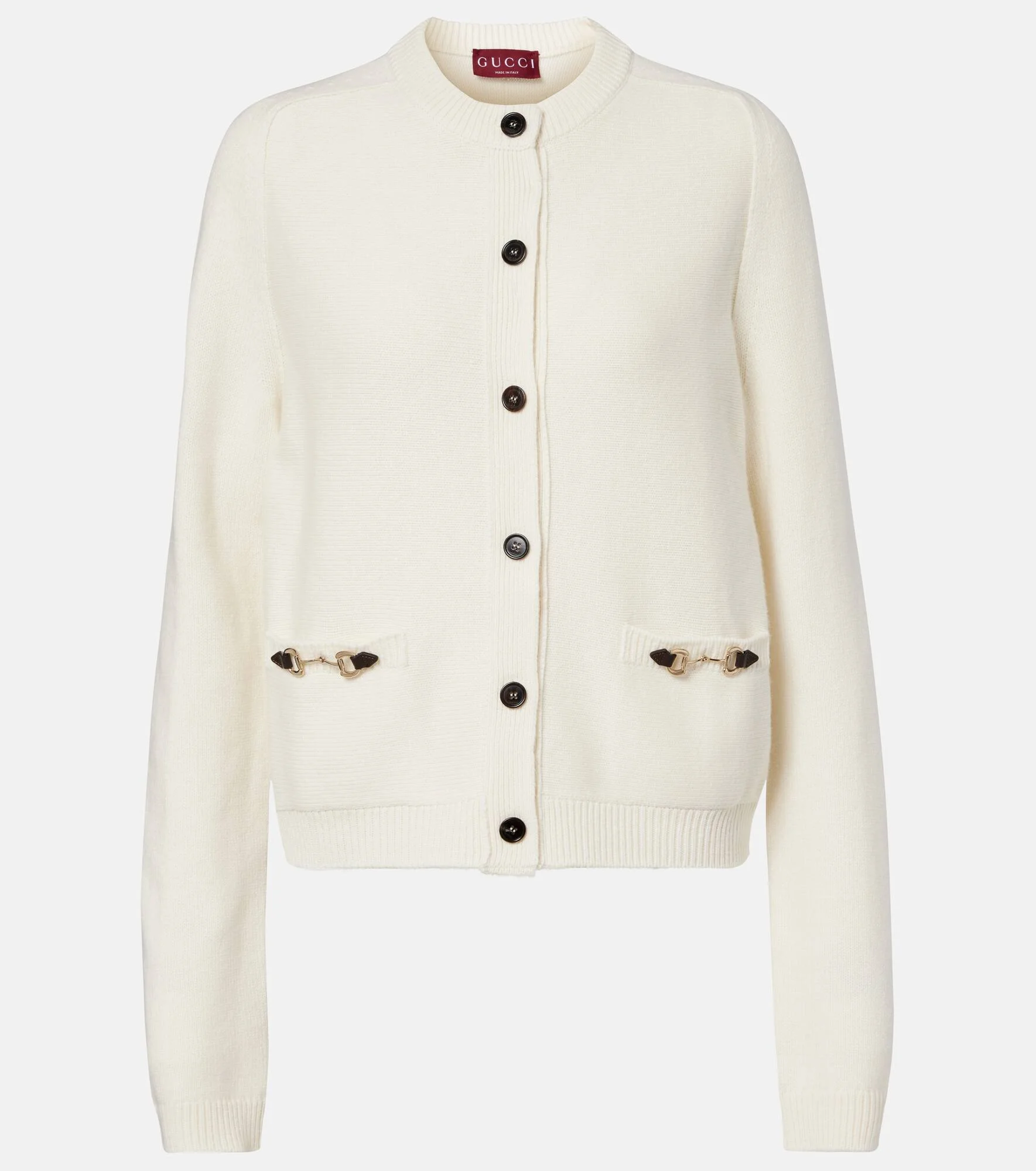 Detailed with iconic hardware, this snap-buttoned cardigan is expertly Italian-crafted from wool and cashmere. One of Gucci's most powerful emblems, the Horsebit points to the house's storied fascination with equestrian design codes. Product Details - Material: 70% wool, 30% cashmere - Care instructions: dry clean - Made in Italy - Color: white - Designer color name: White/Mix - Item color: white - Details: 50% calf leather, 50% brass - Contains non-textile parts of animal origin - Hardware color: gold - Closure: buttoned front - Pockets: snap-buttoned pockets - Cuff: ribbed - Hem: ribbed - Item number: P01119162 Size & Fit - True to size - Straight fit - Stretchy fabric - Falls to the hip - The model seen in the picture is 178cm-5'10" and wearing a size XS