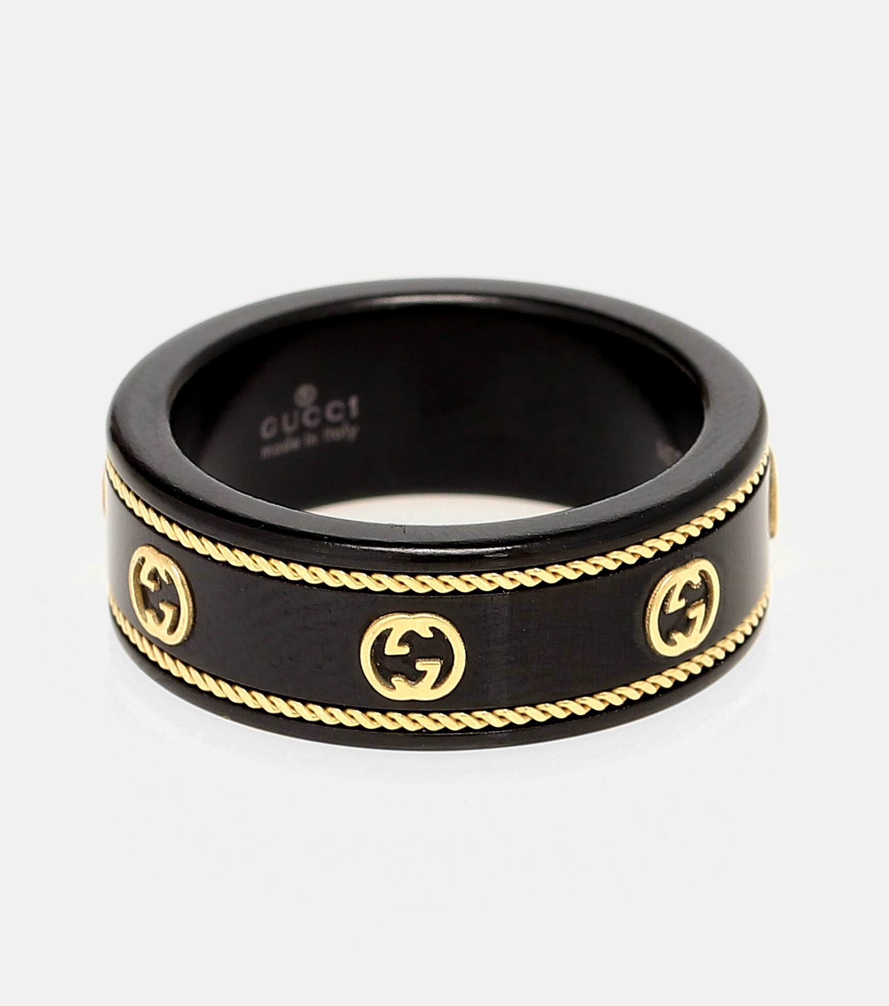 Gucci calls upon one of the its most iconic motifs, presenting its Icon ring adorned with interlocking-G insignia. The Italian-crafted design's 18kt yellow-gold accents are set upon a black synthetic-corundum band for striking contrast. Product Details - Material: synthetic corundum, 18kt yellow gold - Made in Italy - Designer color name: Black - Item number: P00443185 Size & Fit - Width 6mm-0.25"